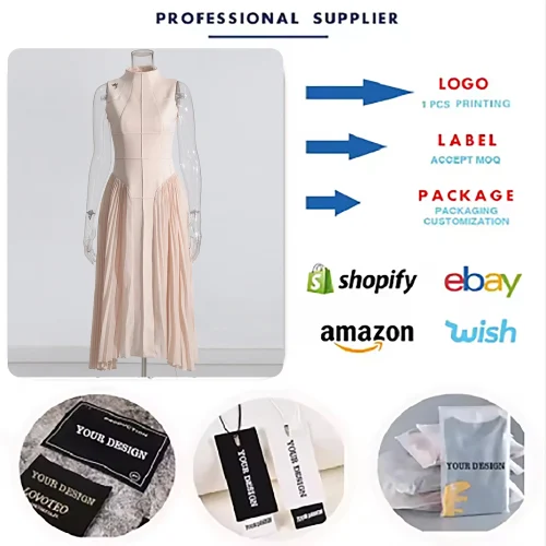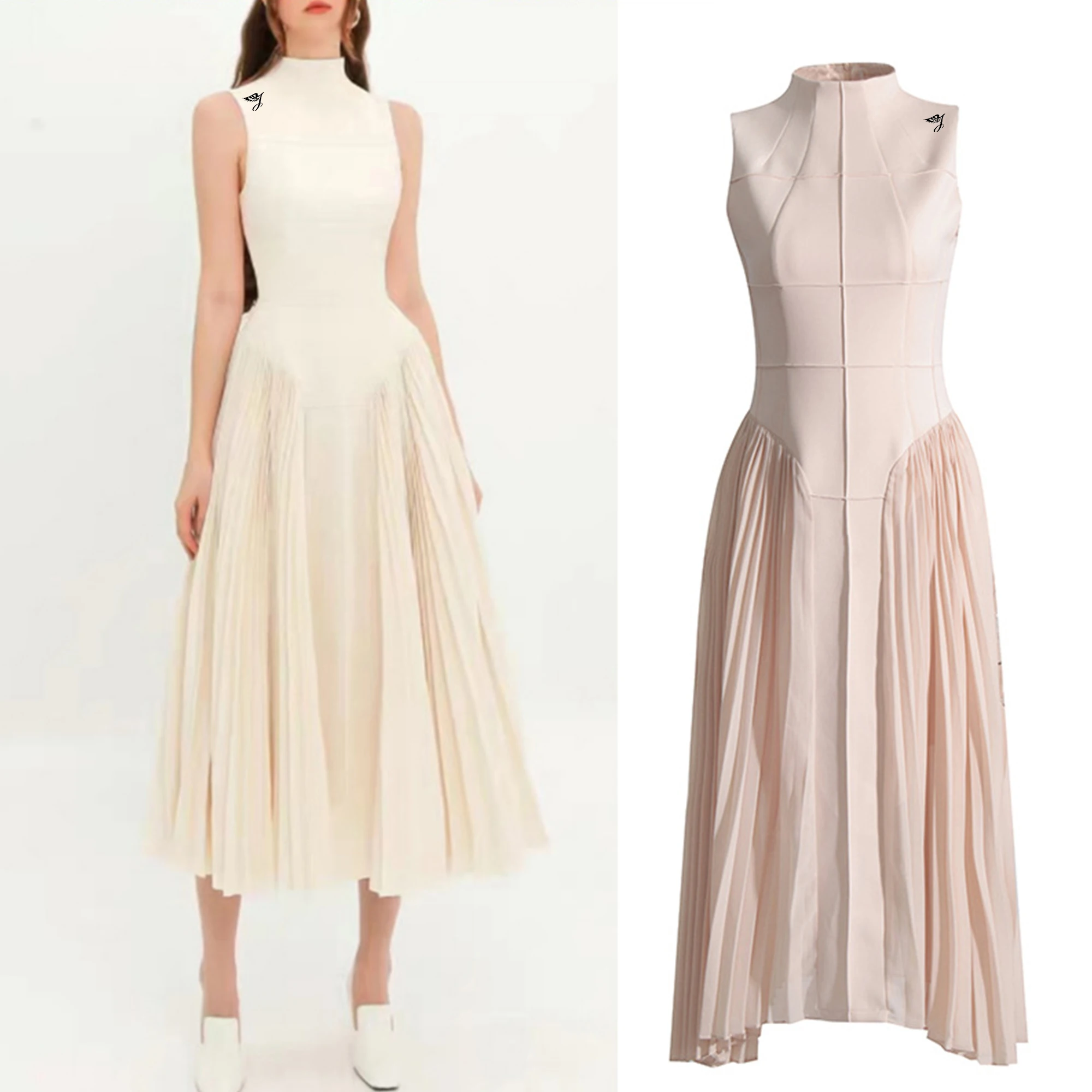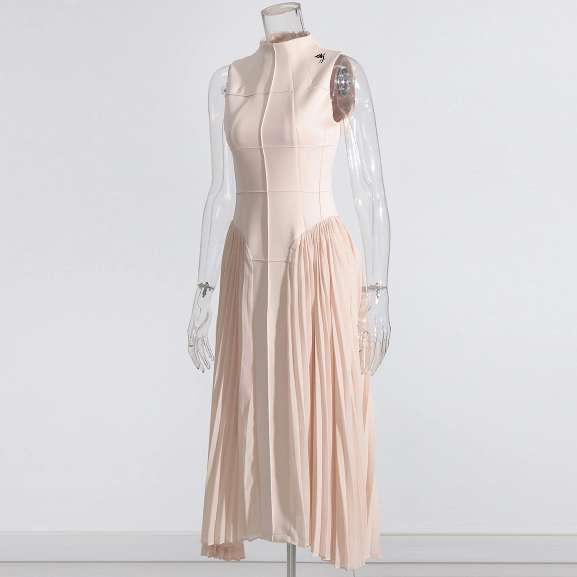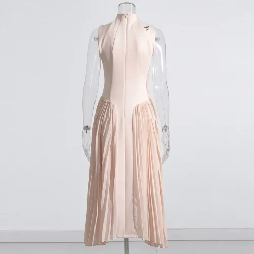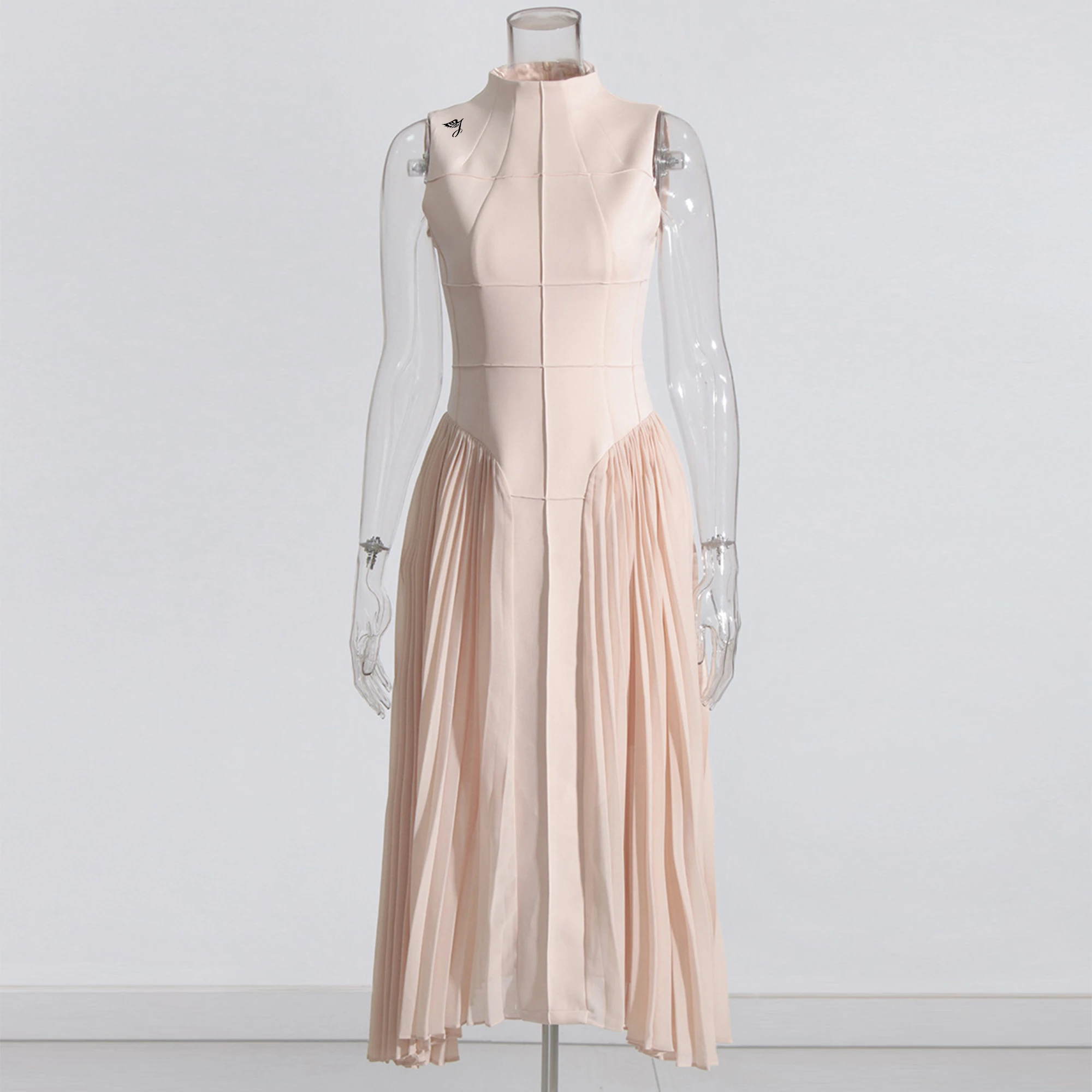 Product Name: European American Casual Summer Dress Simple Niche Design Stand-Up Collar Waist Pleated Sleeveless Maxi Length Dress