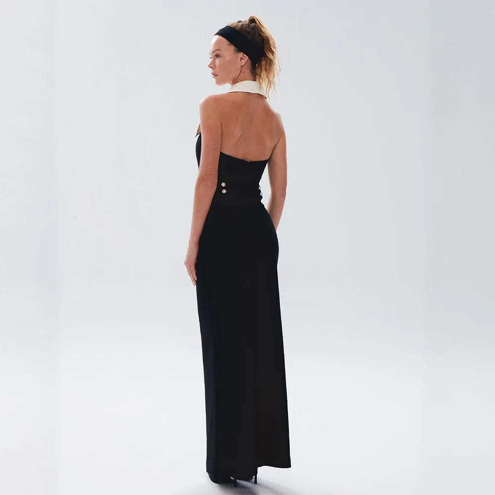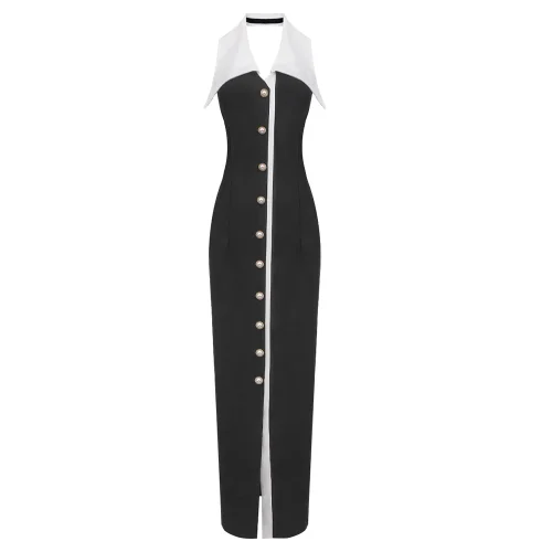 Product Name: Fashion Luxury Black Party Casual Dresses Lapel White Patchwork Button Sleeveless Slim Long Women Dress