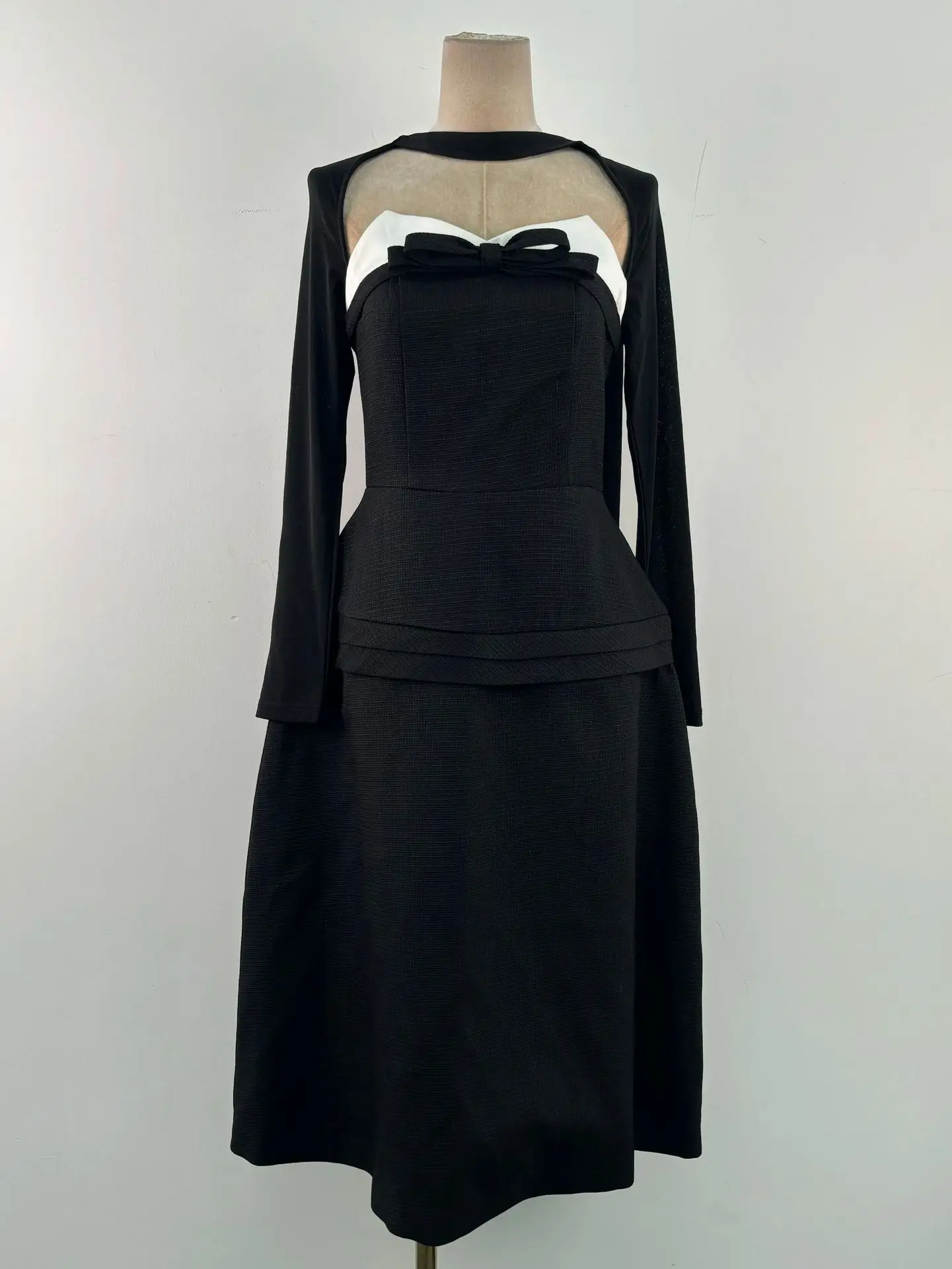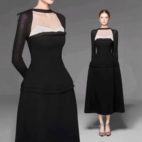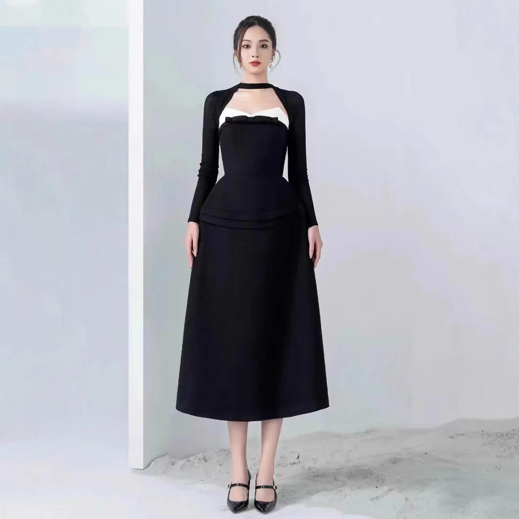 Fashion Temperament Bow Contrast Color Two-piece Dress Senior Sense Halter-neck Long Black Dress