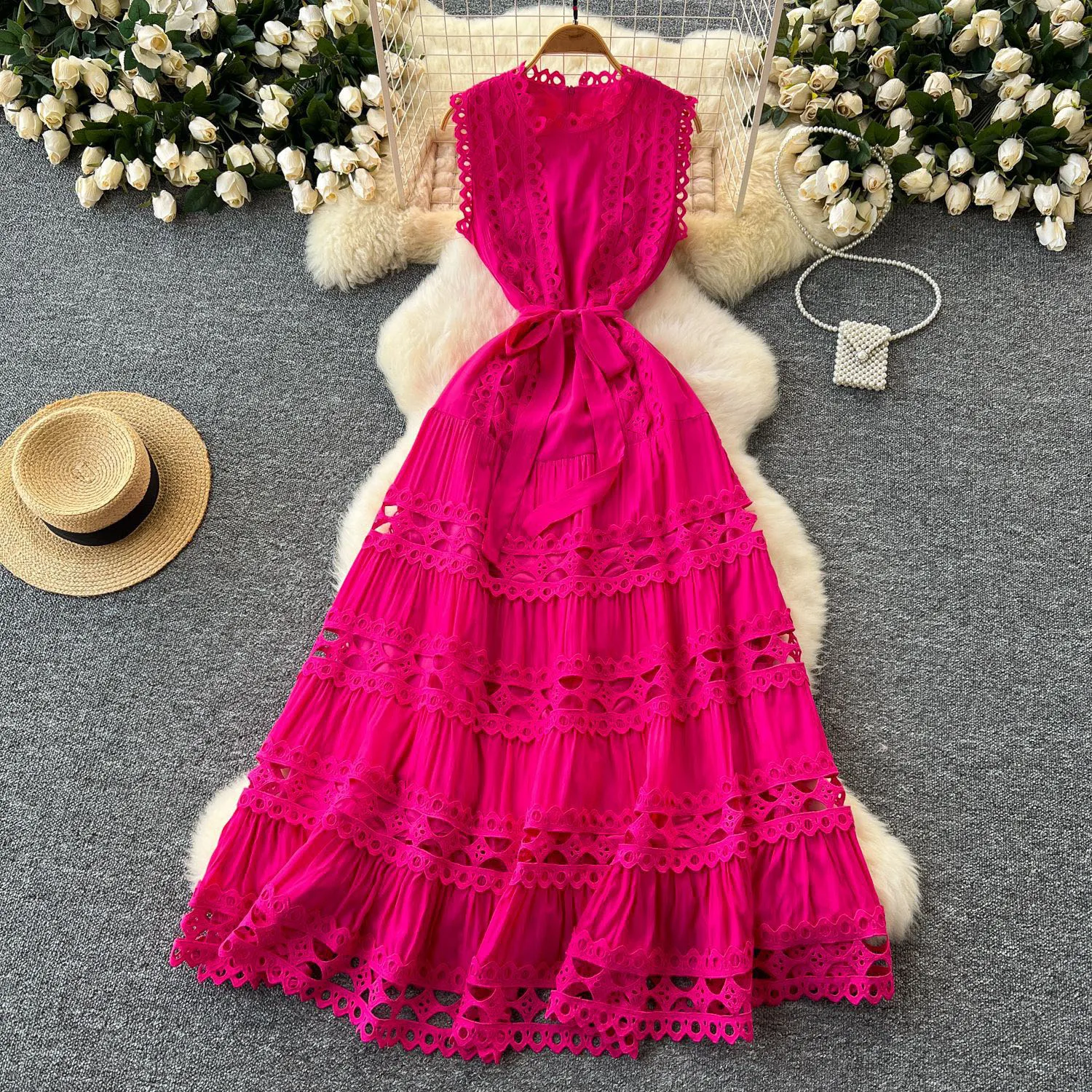 Fashionable and Elegant O-neck Sleeveless Lace Hollow Edge Splicing Layered Skirt Long Dress