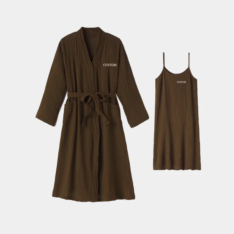 Product Name: Gauze Cotton Pyjama Sets Women Kimono Wrap Bath Robe Slip Dress Spaghetti Strap 2Piece Lady Muslin PJS Loungewear Robe Set