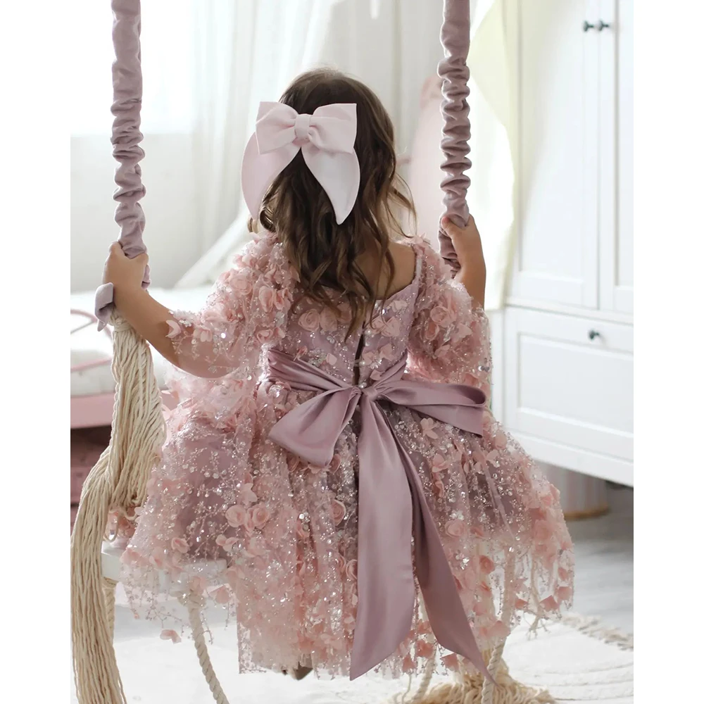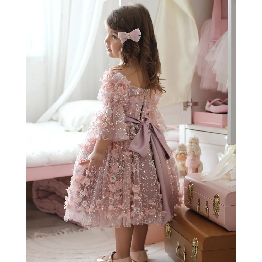 Product Name: Gorgeous Pink Sequin 3D Flowers Kids Princess Girl Dress Half Sleeves Knee Length Girls Party Dresses for Wedding