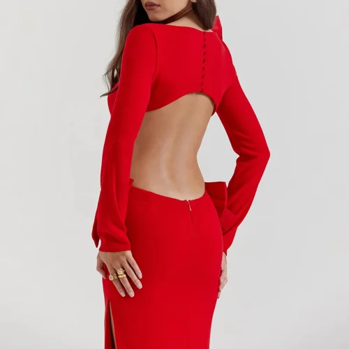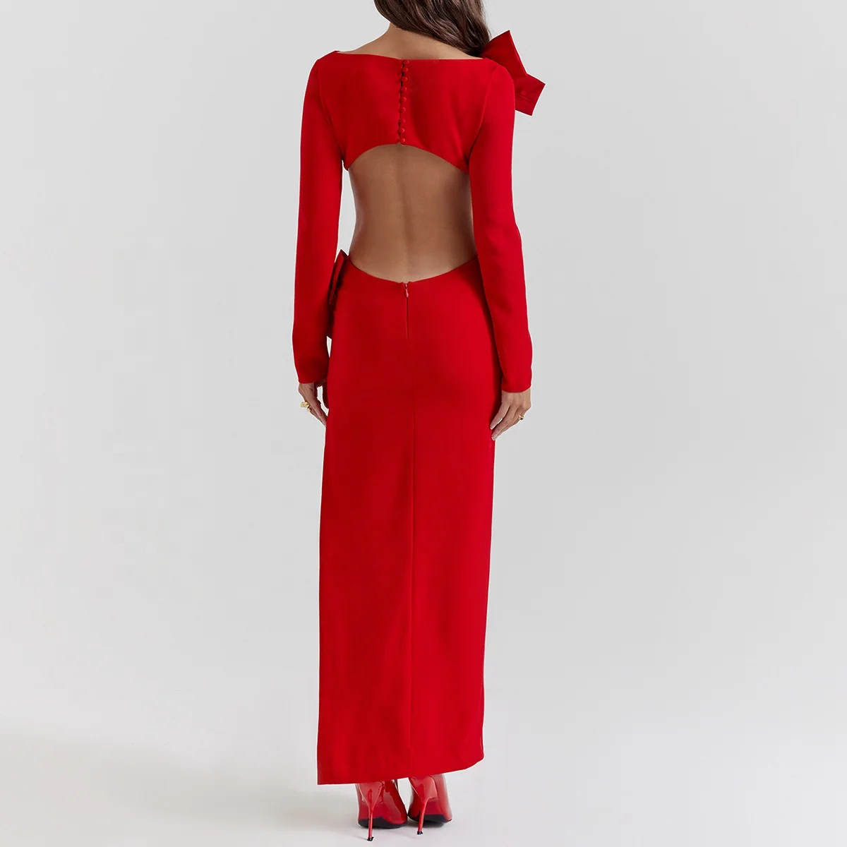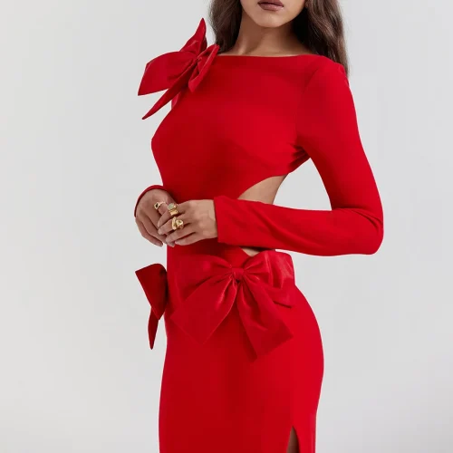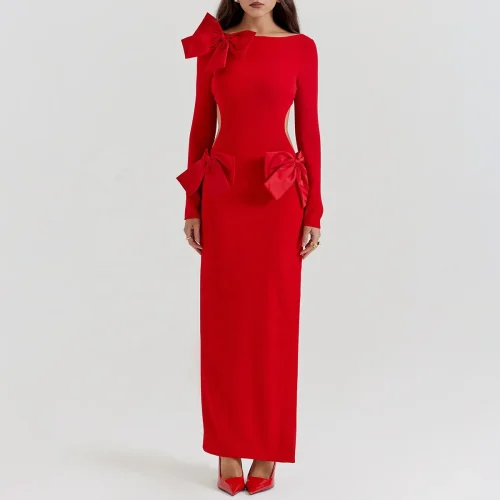 Product Name: GS Elegant Red Bow Maxi Dress – Eye-Catching Formal Attire for Red Carpet Events