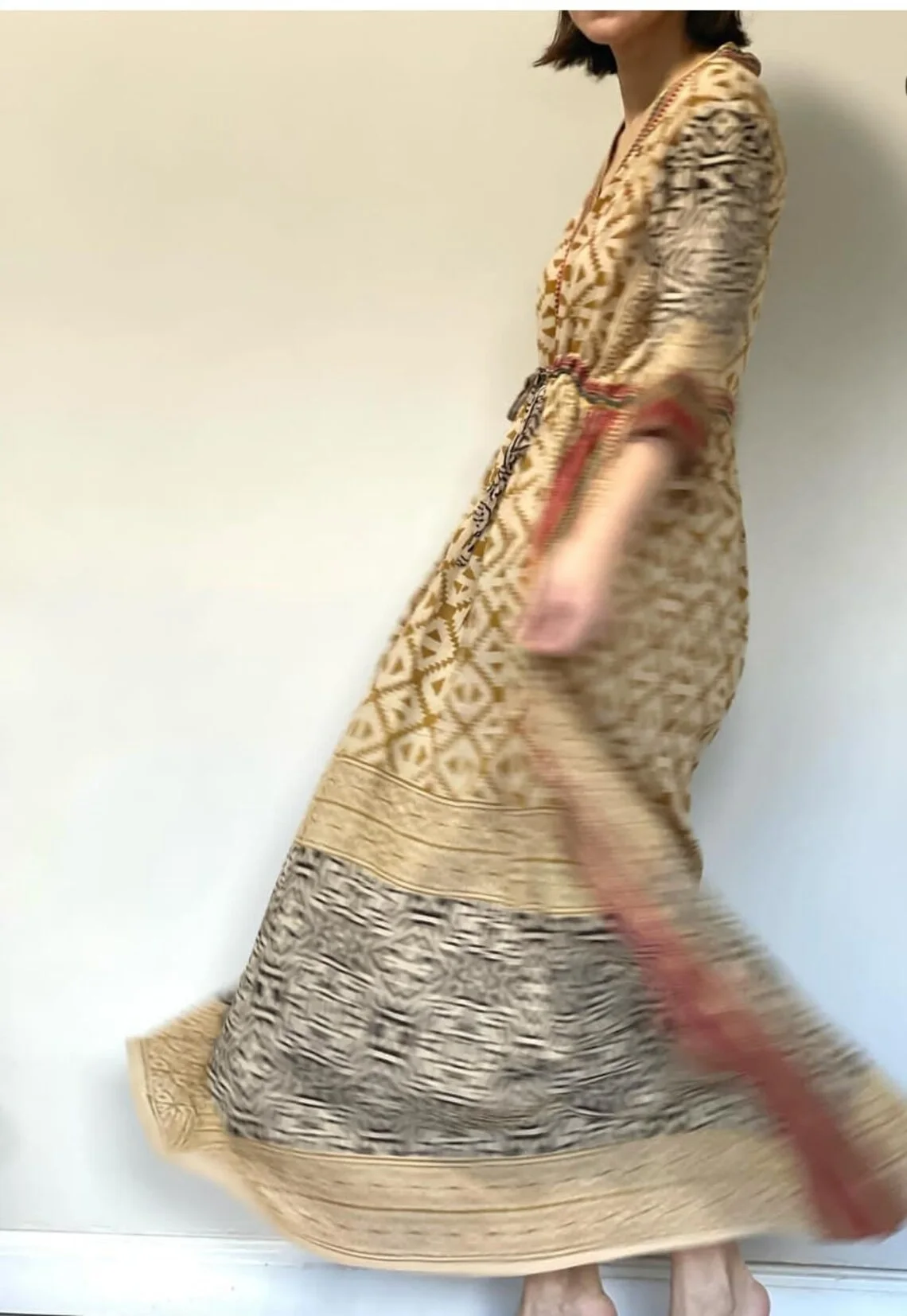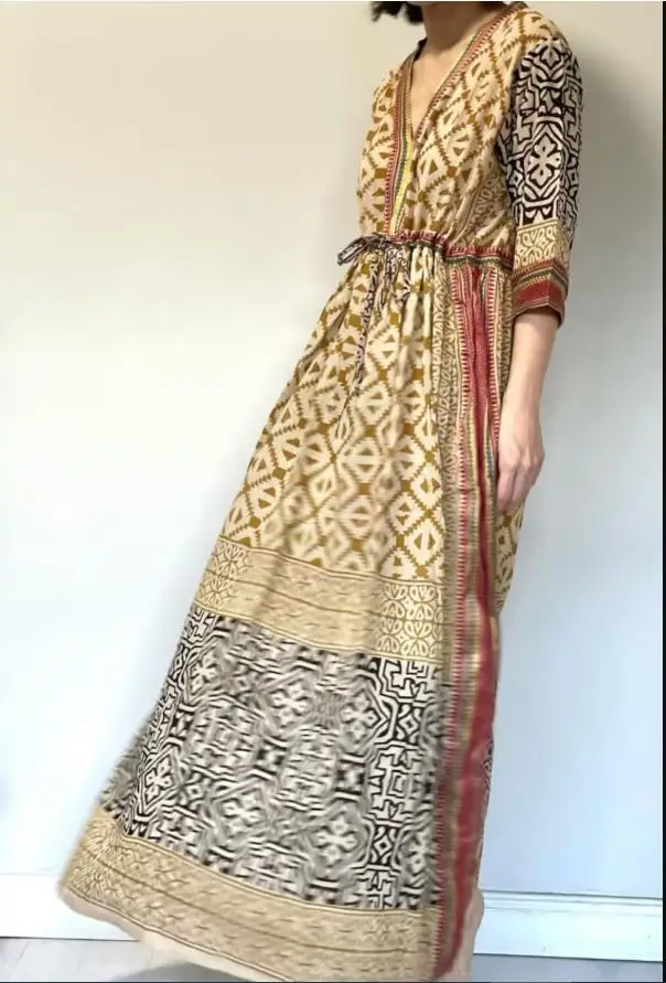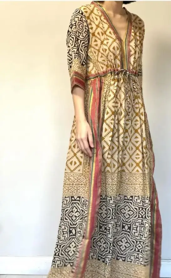 Hand Block Print Long Kaftan Zari Border Cotton Maxi Dress V Neck Sundress for Women Maxi Dress with Slit Green Beach Dress