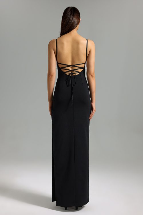 Henrietta Feather Side Slit Bandage Maxi Dress – Black