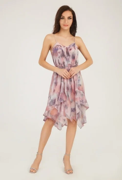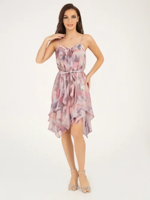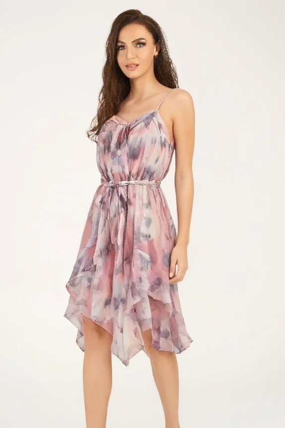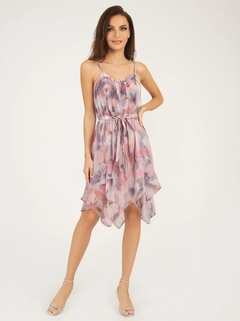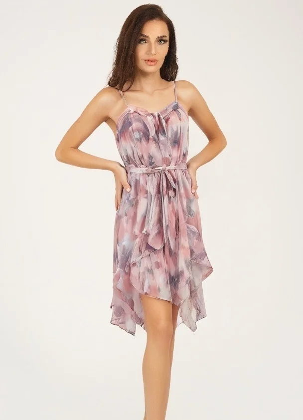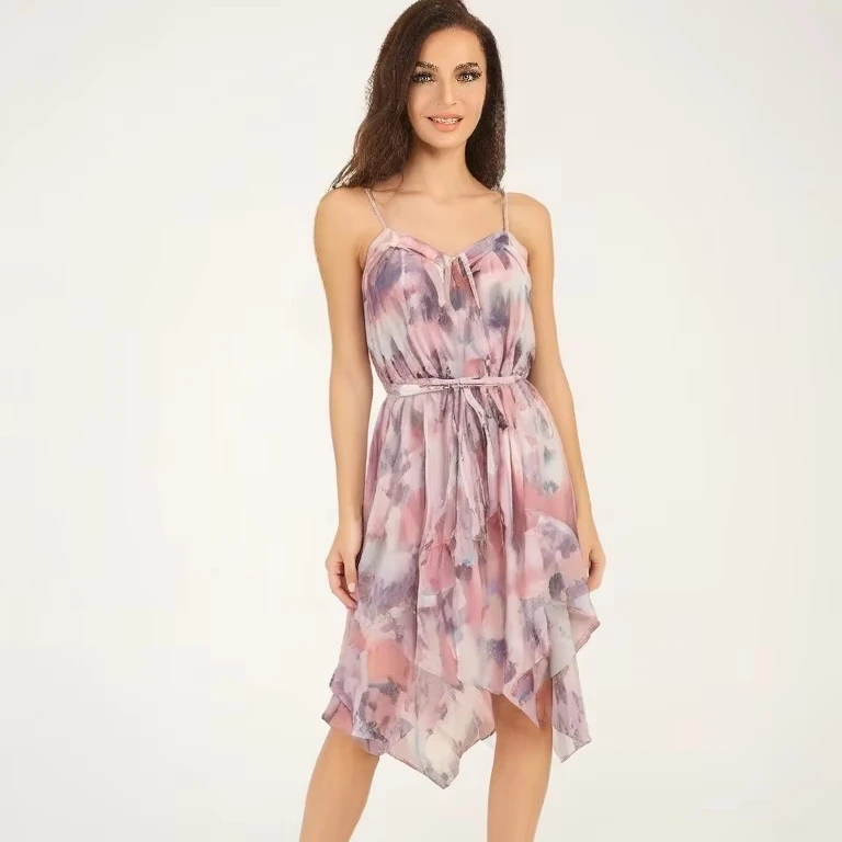 High End Women’s Summer Resort Dress Printed Sexy Camisole Ruffles Spaghetti Strap Empire Waist Casual Style Chiffon