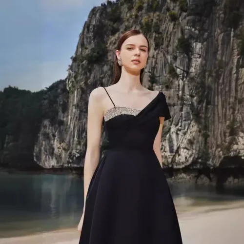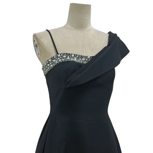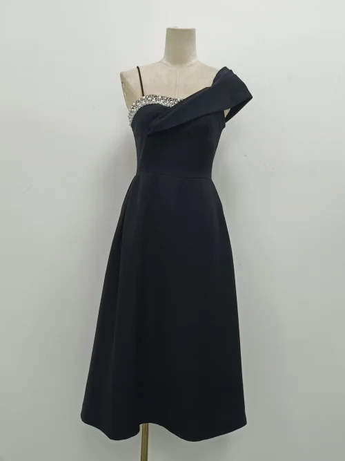 Product Name: High-grade Ethos Diamond-set Black Dress Diagonal Shoulder Long Dress Elegant Slimming Halter Dress