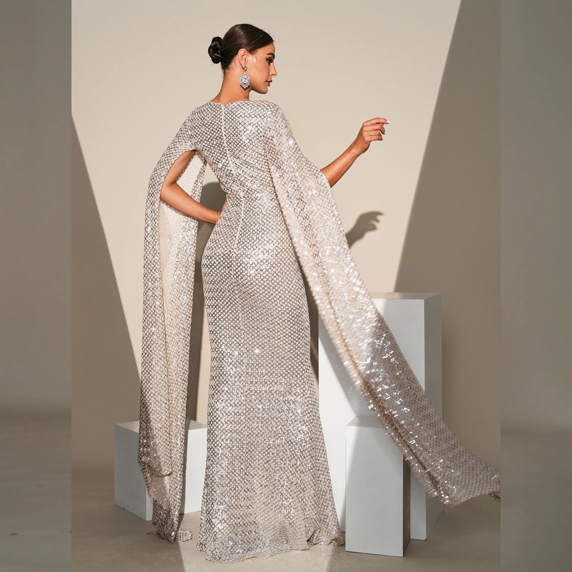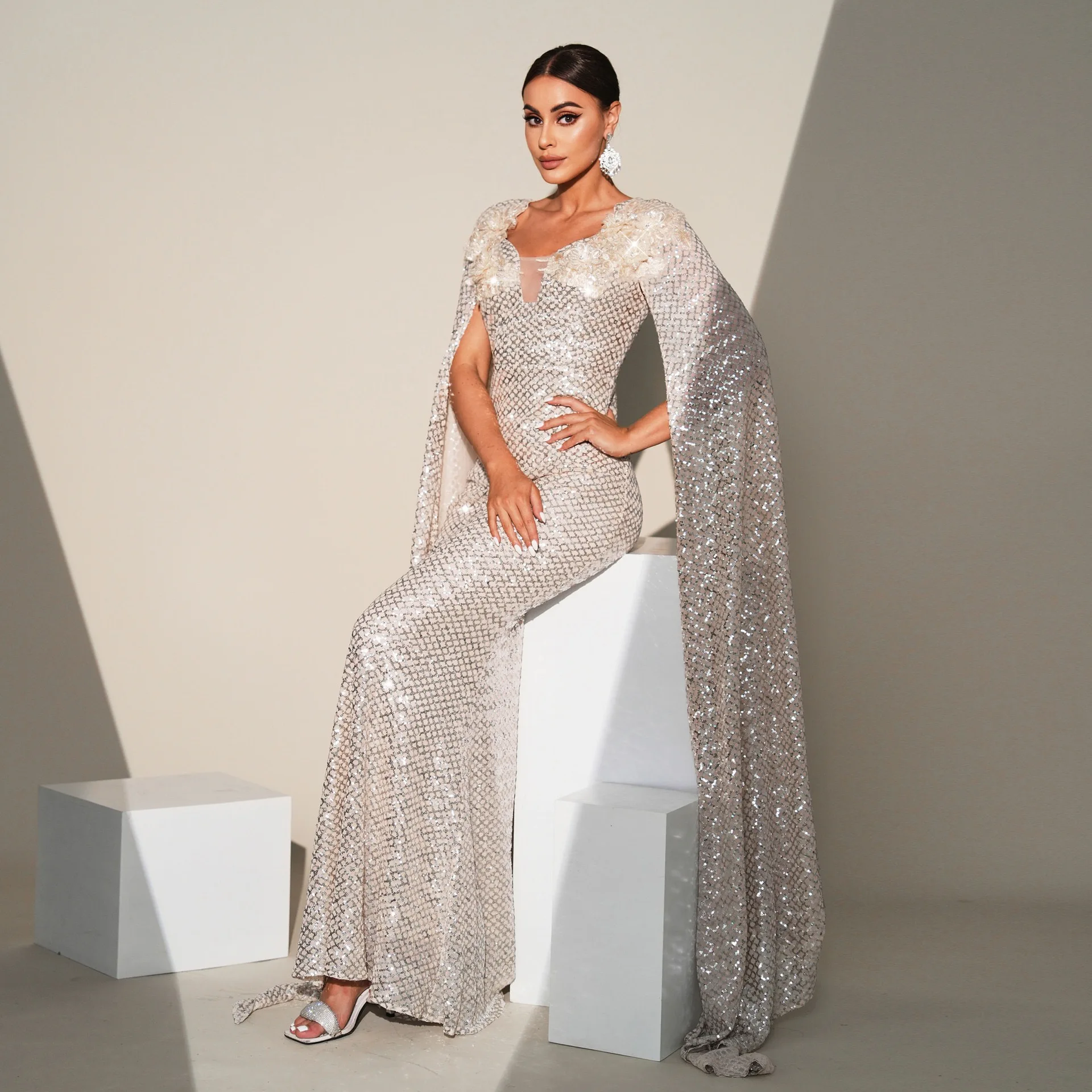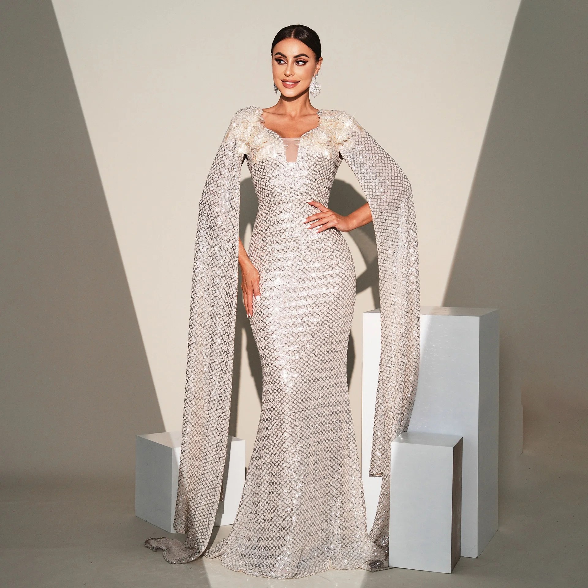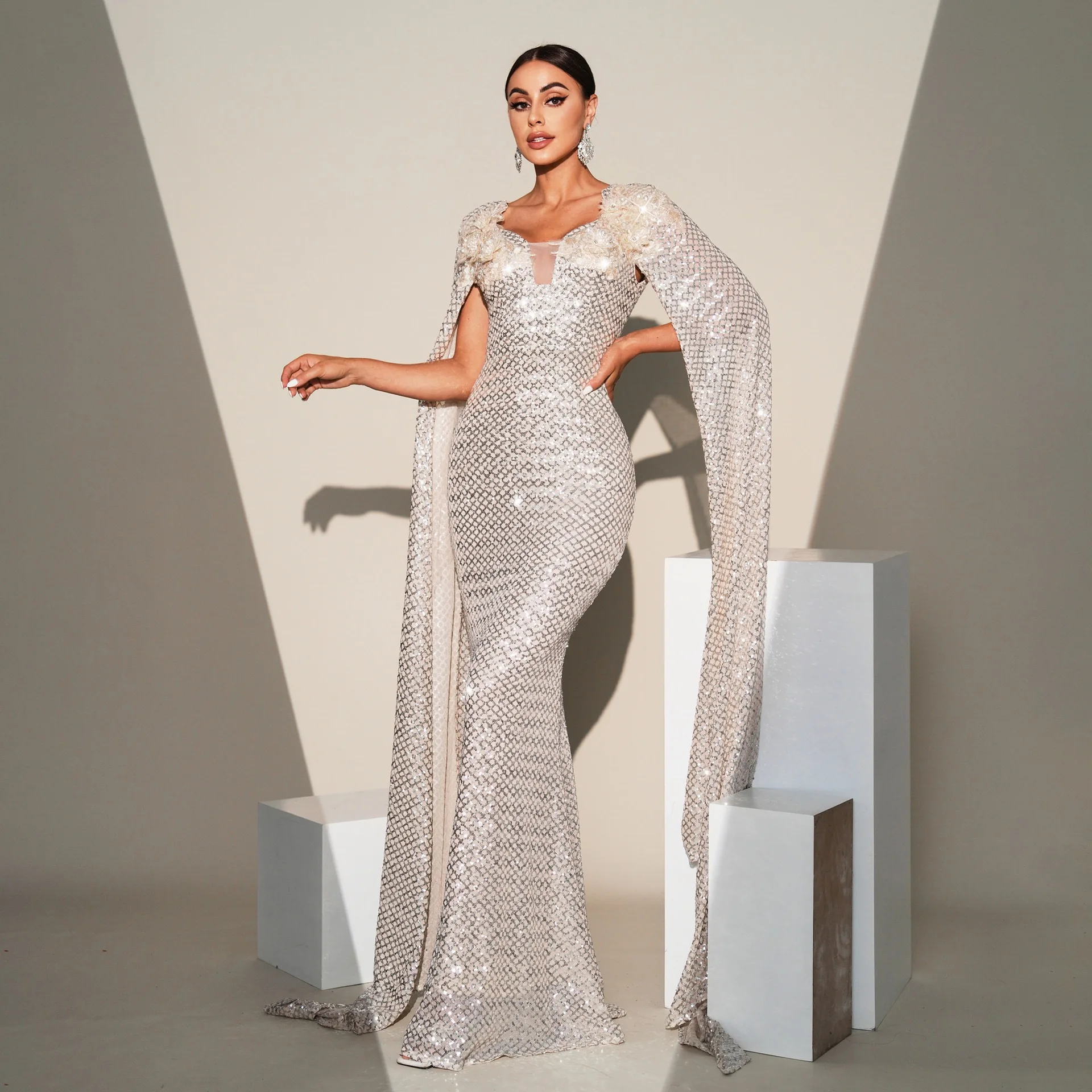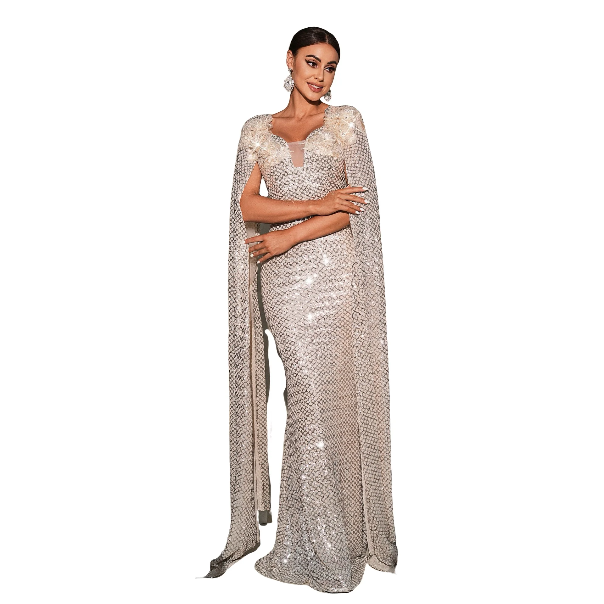 In Stock Middle East US & Europe Sequined Cape Shoulder Design Pearl Color Fishtail Design Long Dress Women Party Gowns