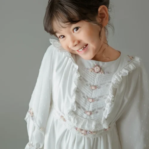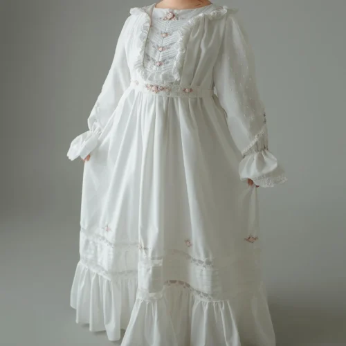 Product Name: Julie 100% Cotton Baby Girl Baptism Christening Wedding Dress-Handcrafted White with Long Sleeves Embroidered Flower O-Necked