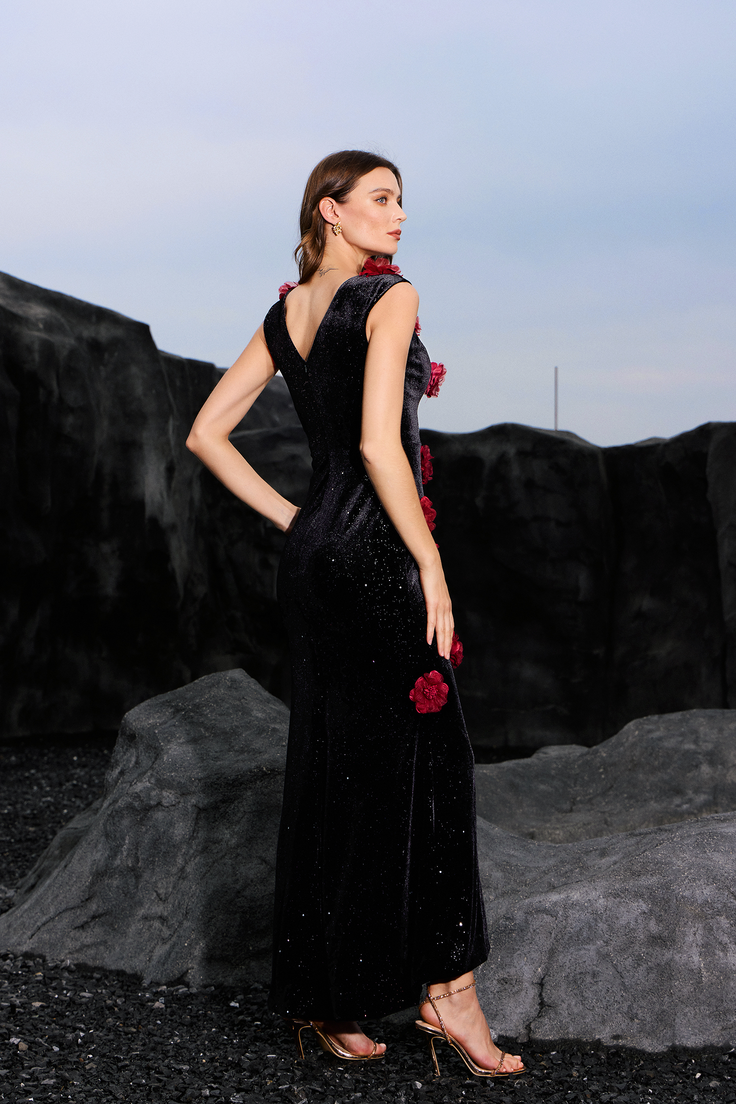 Kimivi Deep-V Sleeveless Flowers Maxi Dress