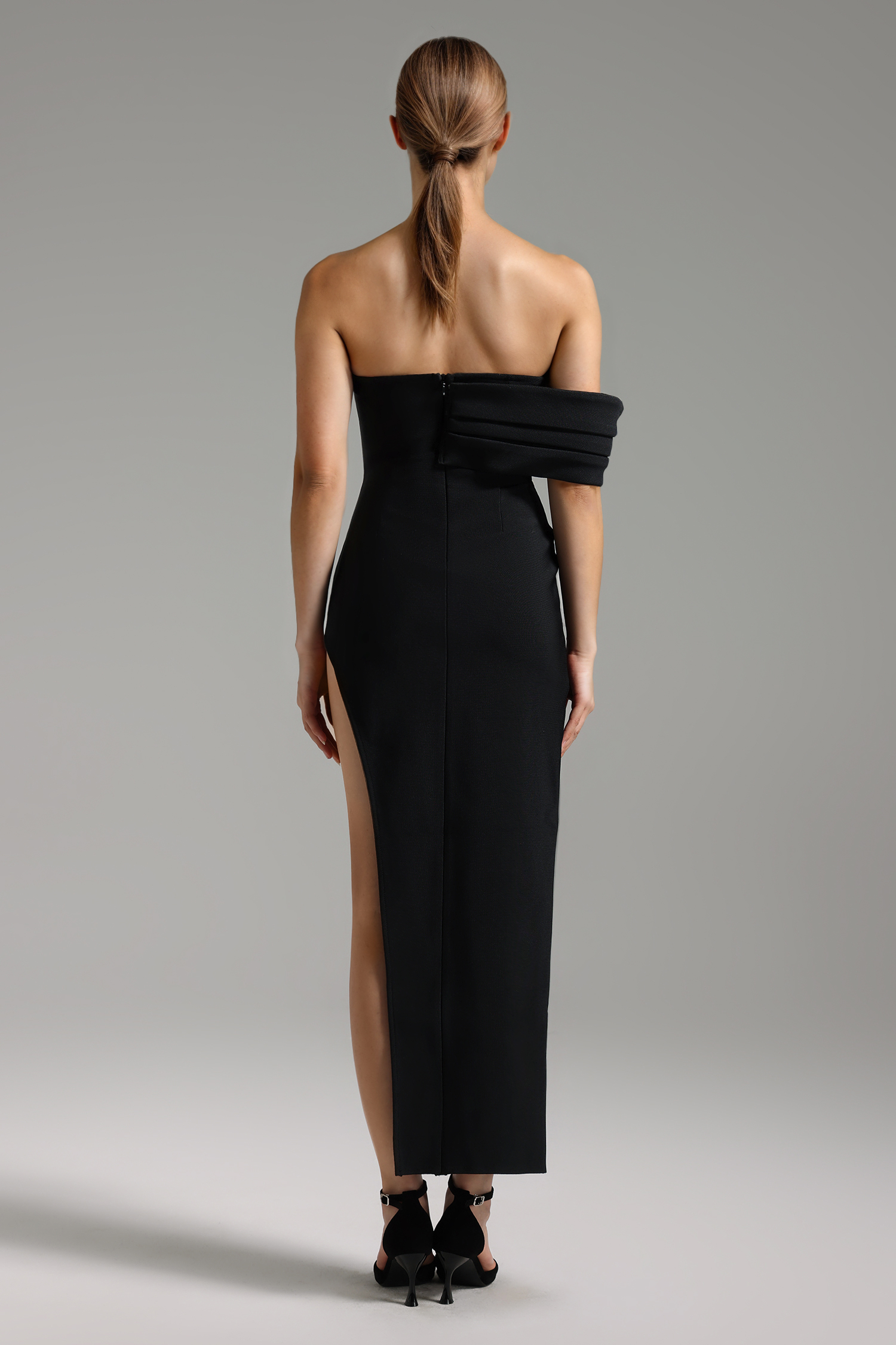 Kyra One Sleeve Pearl Bandage Midi Dress – Black