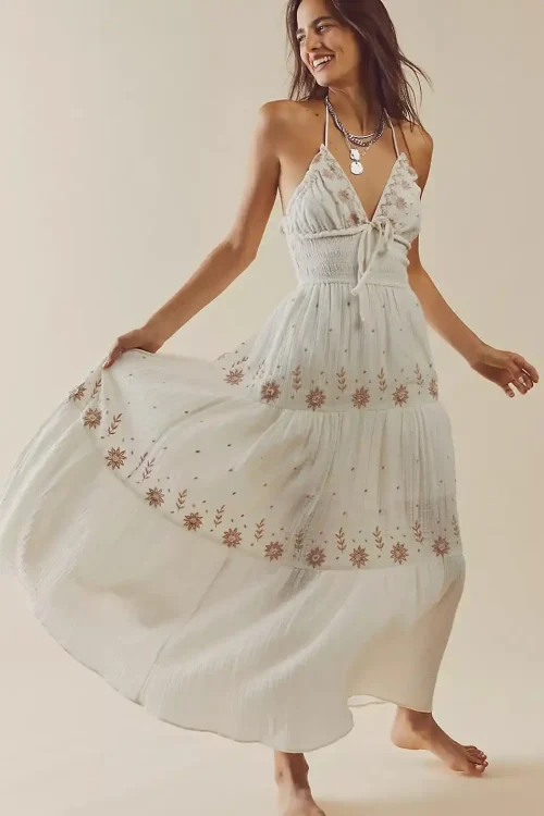 Long Dress 2022 Summer Casual Maxi Dresses Ladies Bohemian Sundress Backless Smocking Maxi Boho Dress
