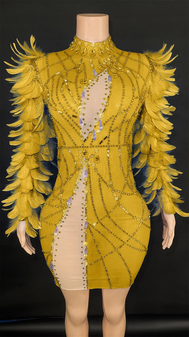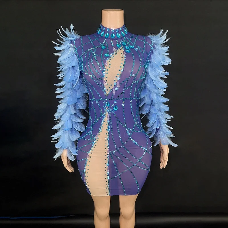Product Name: Luxury Evening Dresses Sexy Hollow Gorgeous Feather Sleeves Blue Sequin Dress Party Evening Performance Dress