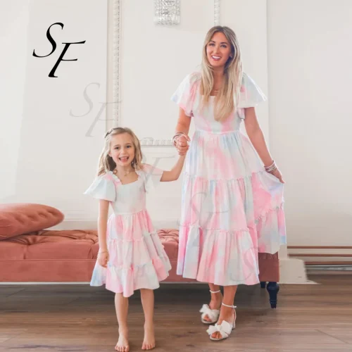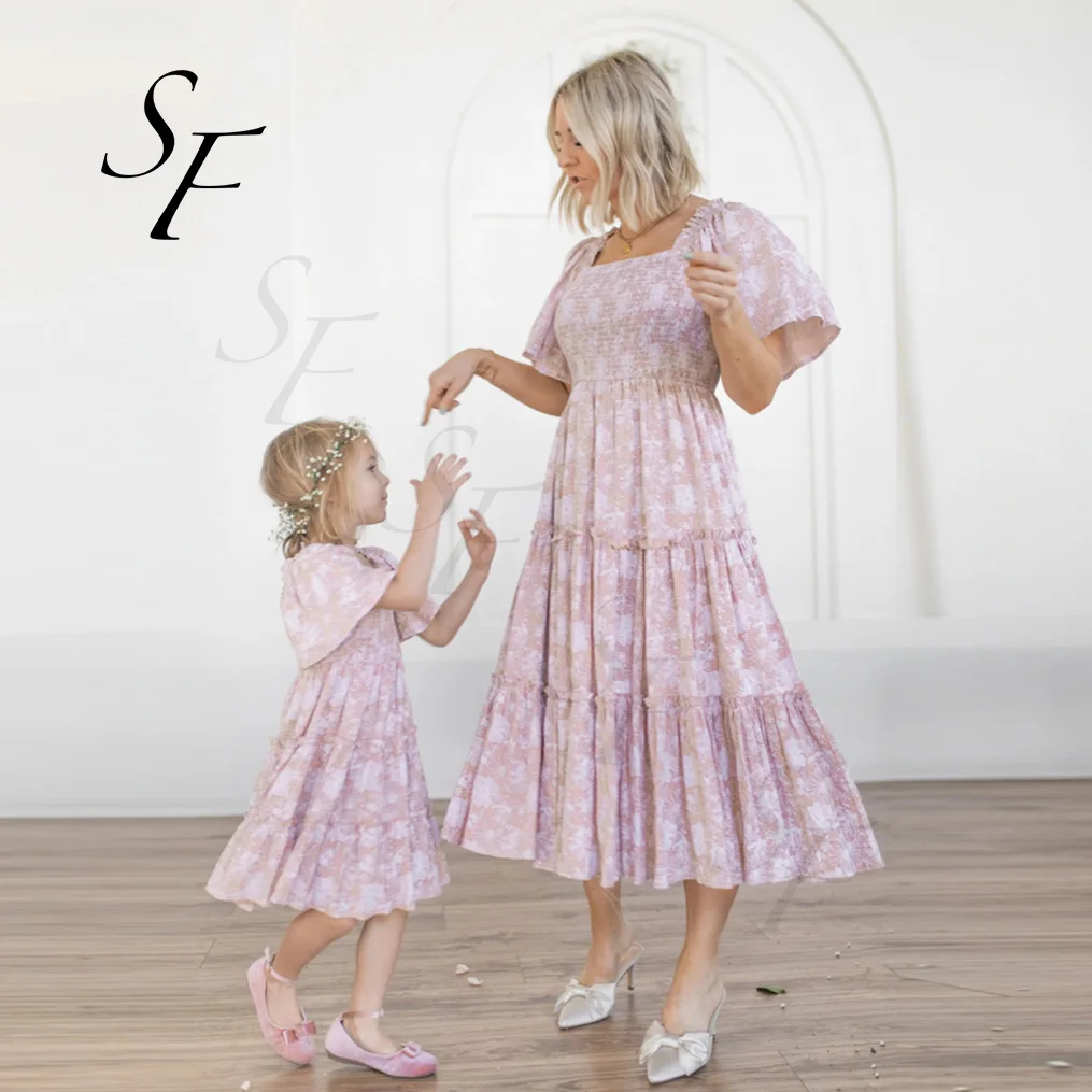 Matching Short Sleeve Midi Dress Vestidos Loose Fit Parent-Child Family Matching Outfits Long Skirt Linen for Family