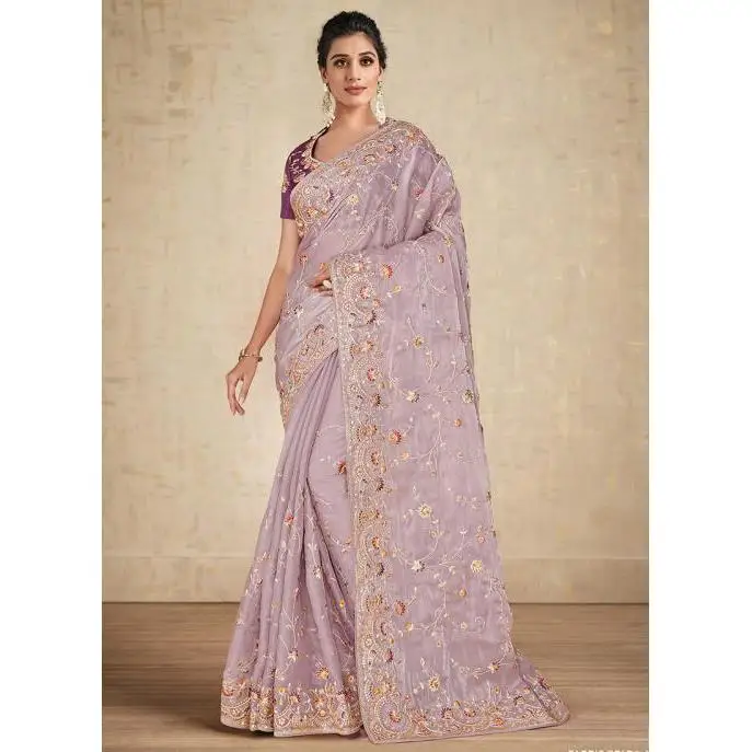 Mauve Satin Silk Saree with Embroidery Work Elegant Party Wear Evening Dress