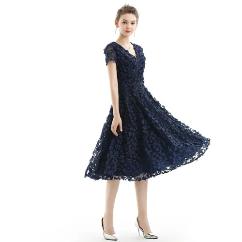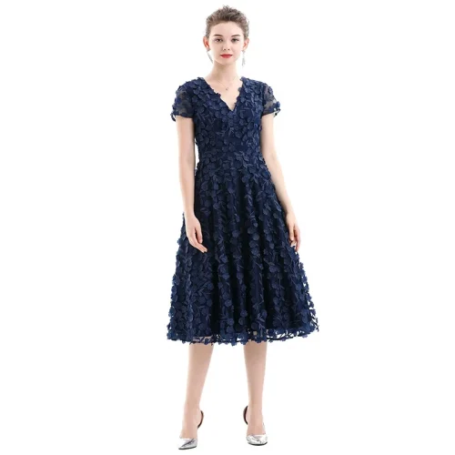 ND063-1 Odm 3D Flower Embroidered Tulle V Neck Sleeves Flared Midi Evening Dress for Women