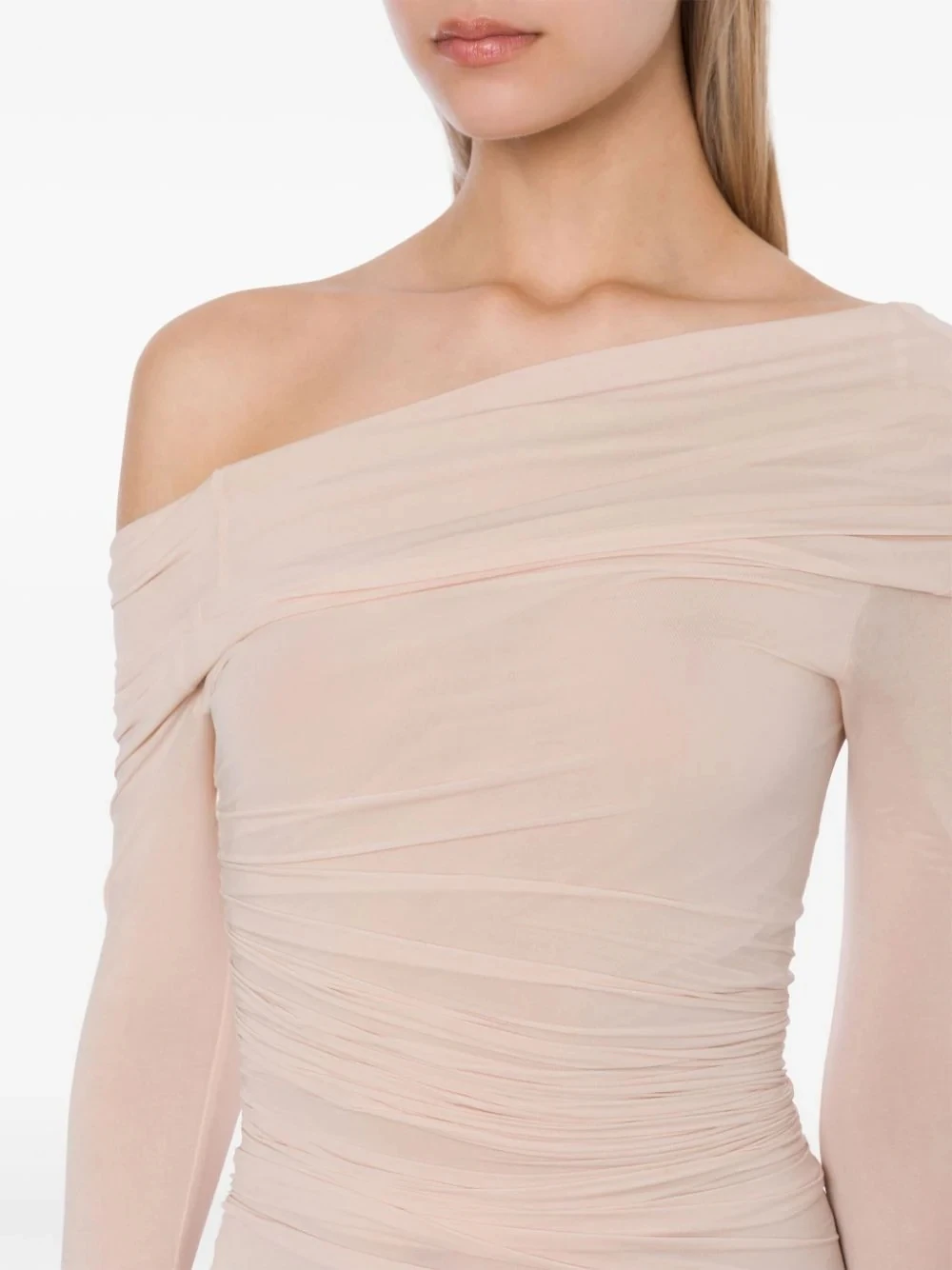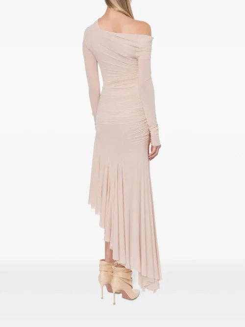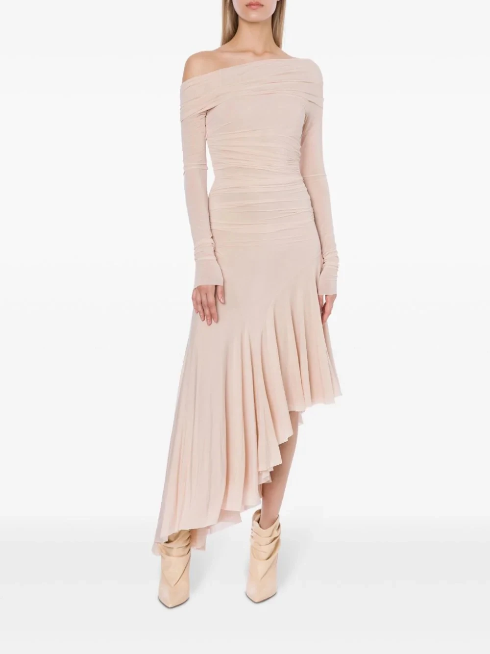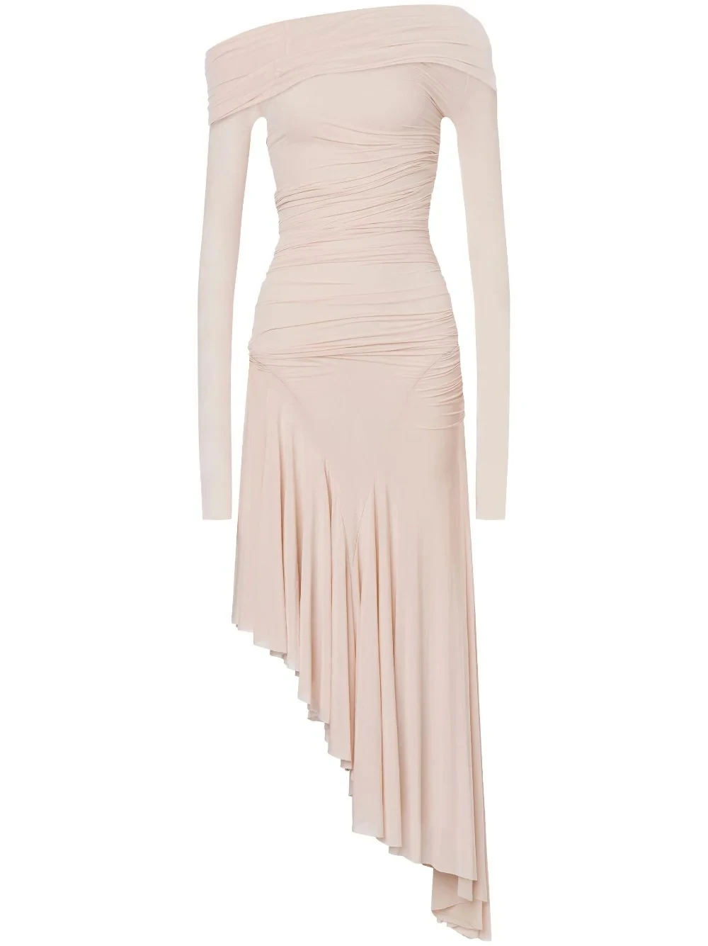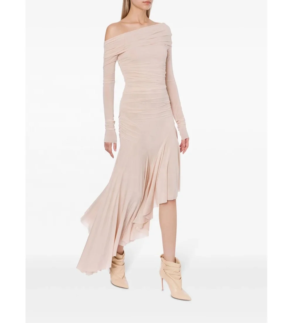 Product Name: New Arrival Draped Asymmetric Neck Extra-Long Sleeves Rose Pink Midi Dress Women Dress