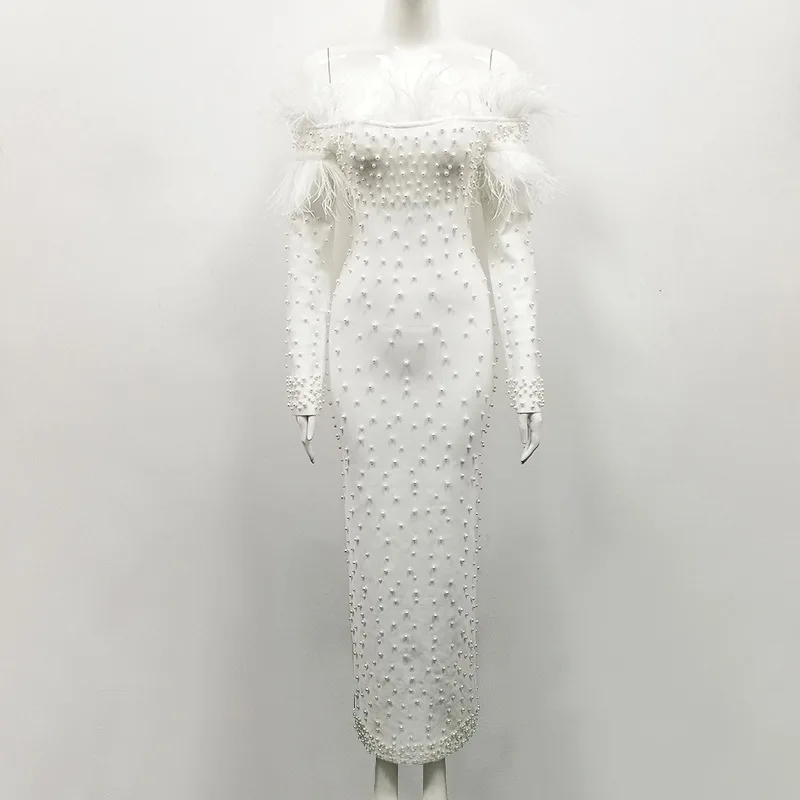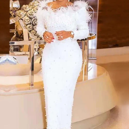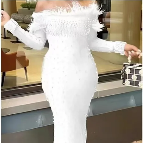 New Fashion Feather Long Sleeve Dresses Slim Tight Nail Bead White Party Dress Evening Dresses