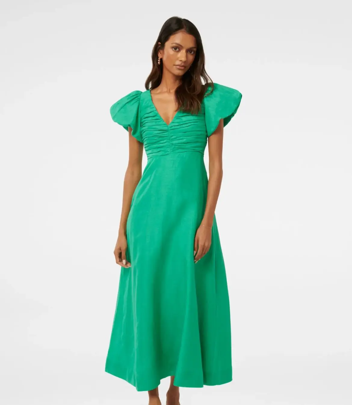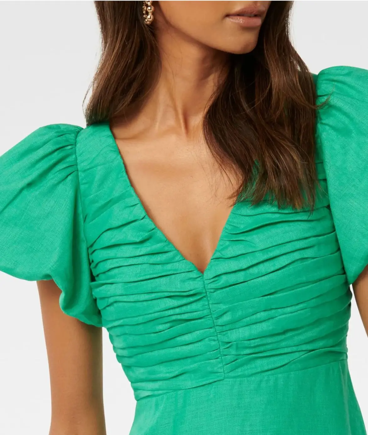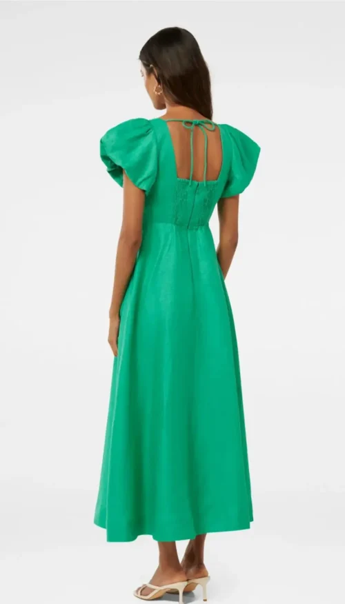 Product Name: New Green Pure Linen June Petite Ruched Midi Dress Korean Long Beach Solid Plain Dress for Women