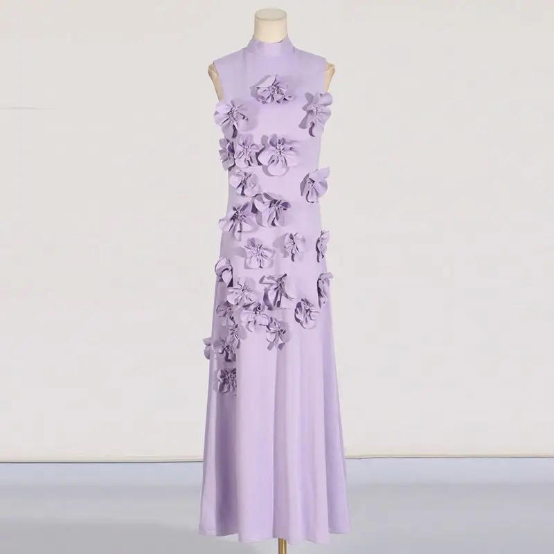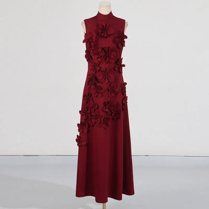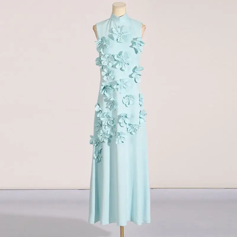 New Socialite Style Three-Dimensional Flower Design Stand Collar Sleeveless Waist Slim Long Dress Designer Dresses Famous Brands