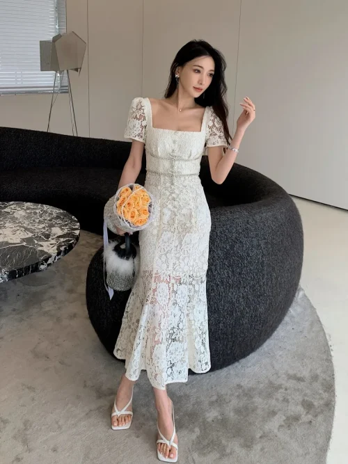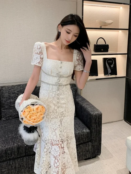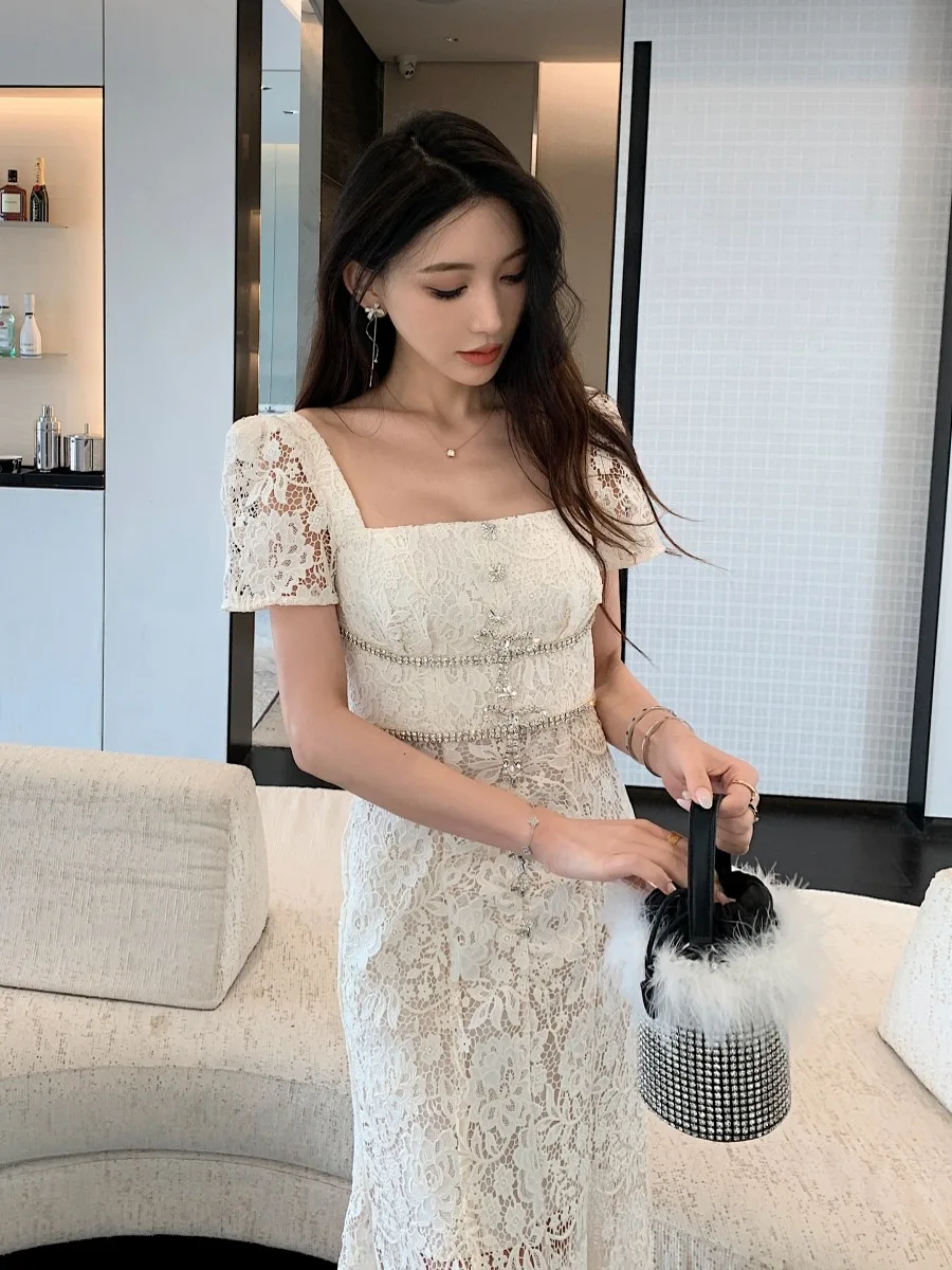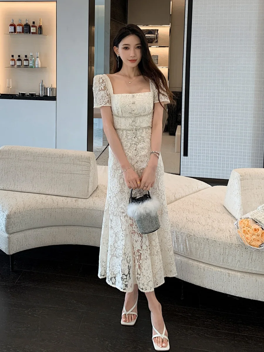 New square Collar Embroidery Lace Dress Diamond Slim Elegant Women’s Dress Short Sleeve White Long Women’s Clothing