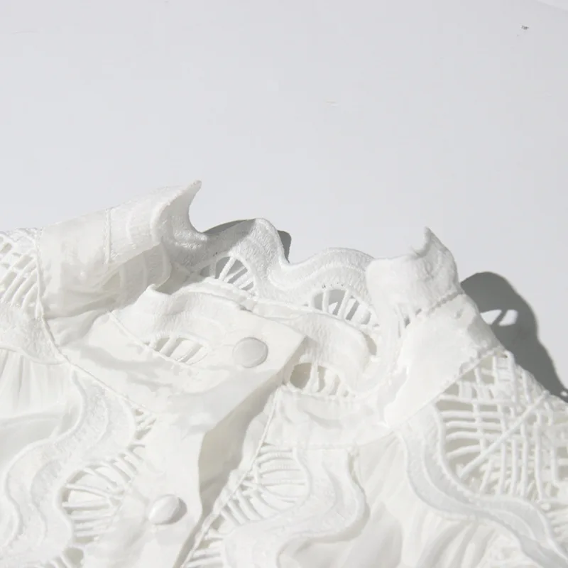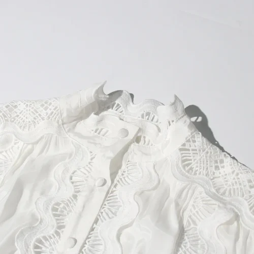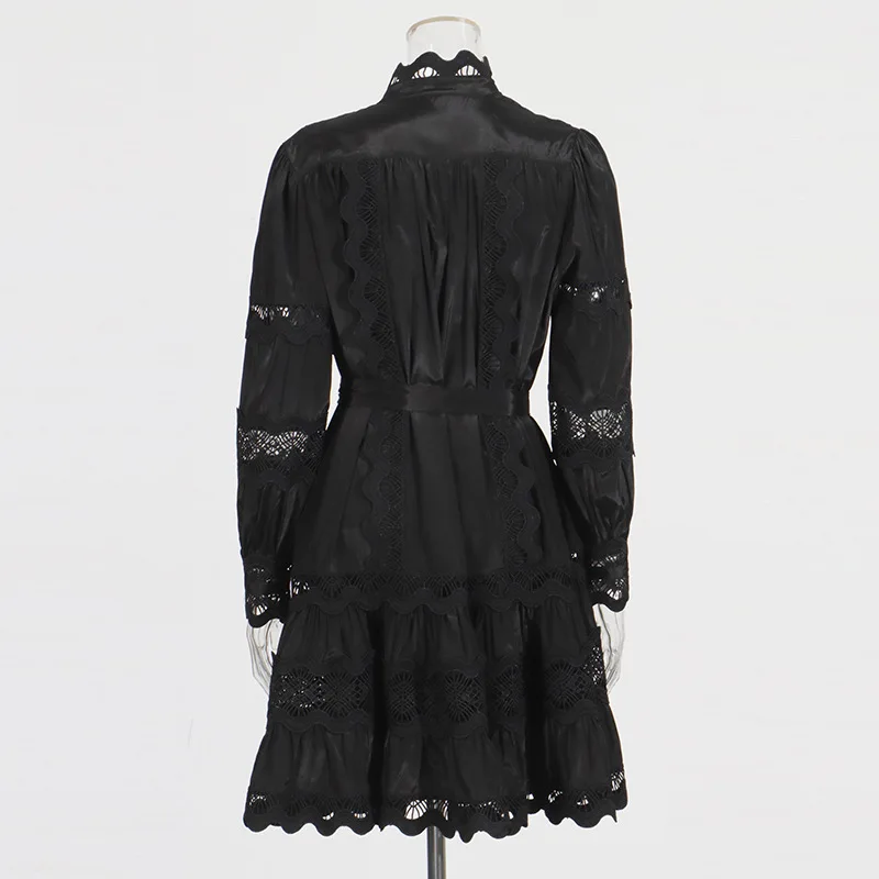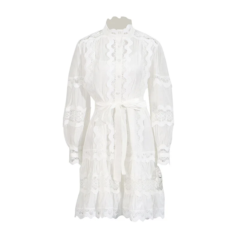 Product Name: New Stand Collar Embroidery Tie Ruffle Lantern Sleeve Pleated Dresses Lace Dress for Women