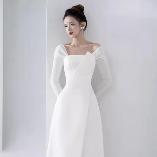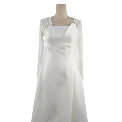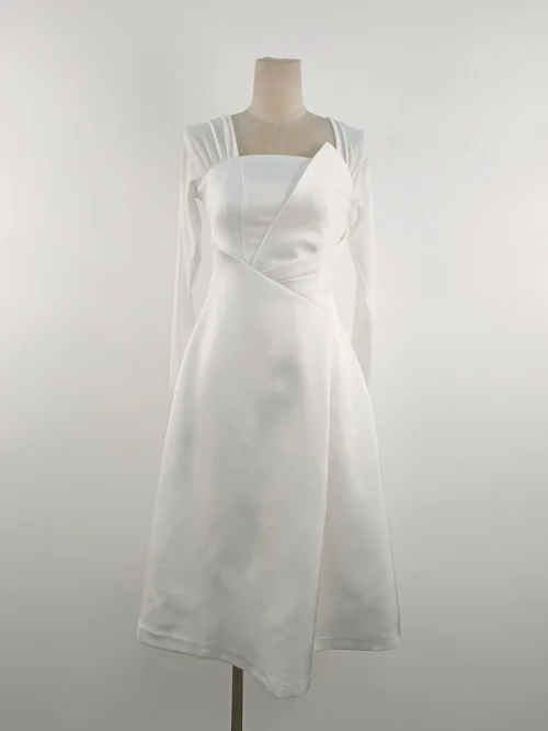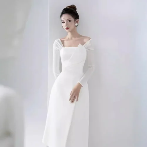 Product Name: New Temperament Design Long Sleeve Women Dress Pleated White Elegant Long Dress