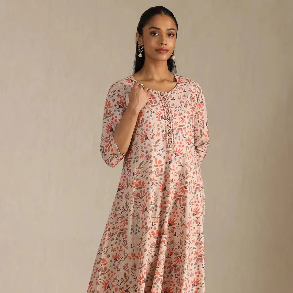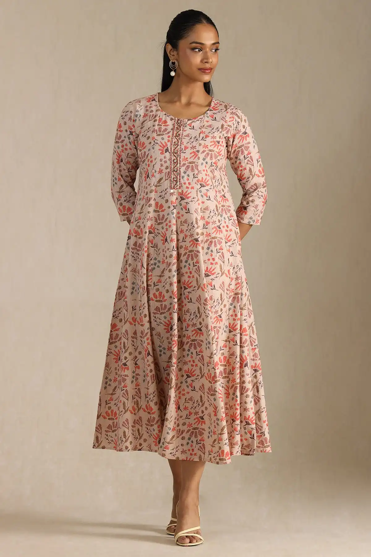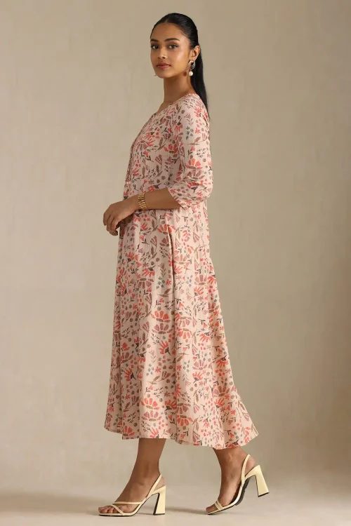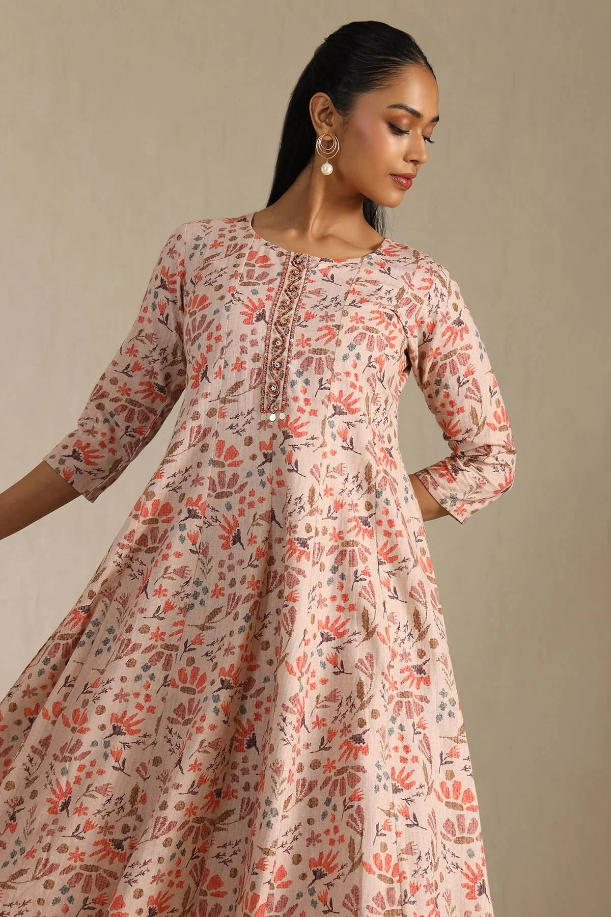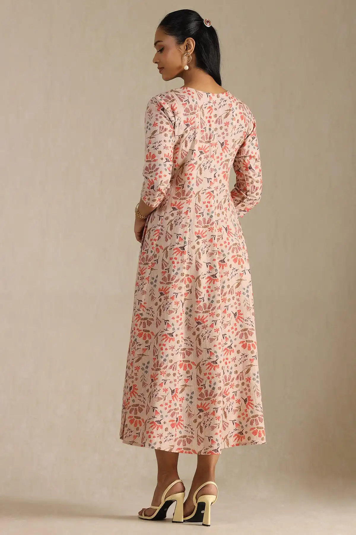 Product Name: Newest Traditional ethnic fashion Peach Cotton Floral Print Dress With Cutdana knee length V neck and all Size Available