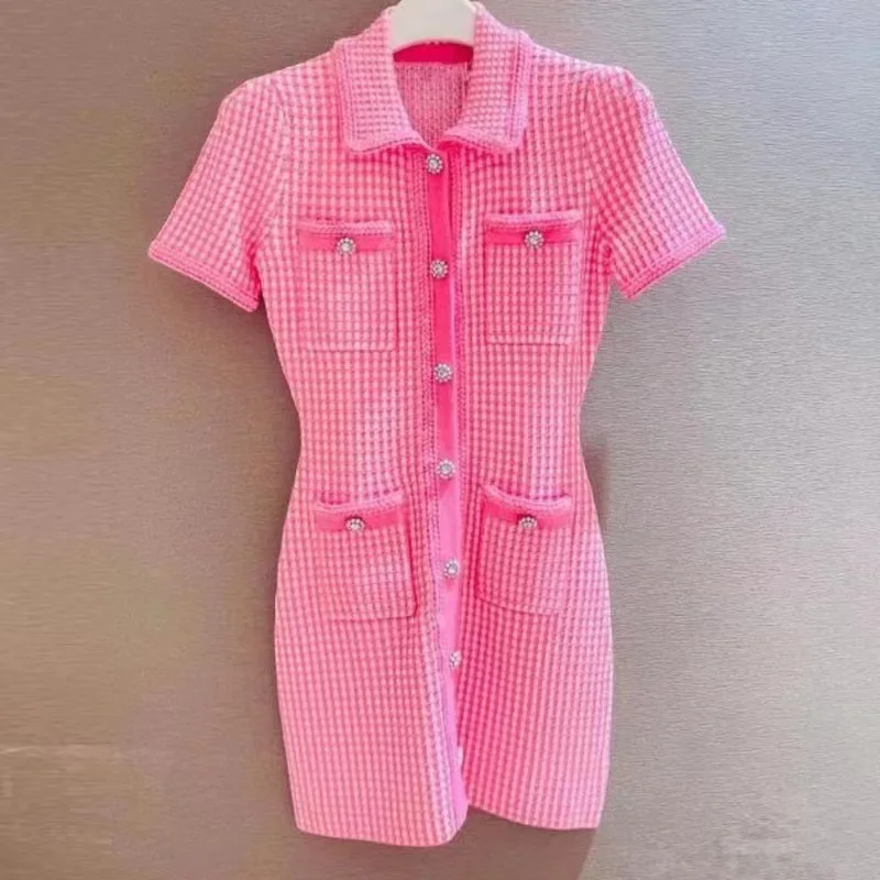 Product Name: NNR New Design Elegant Casual Dresses Women Summer Pink Button Decoration Mini Women Knitted Dresses