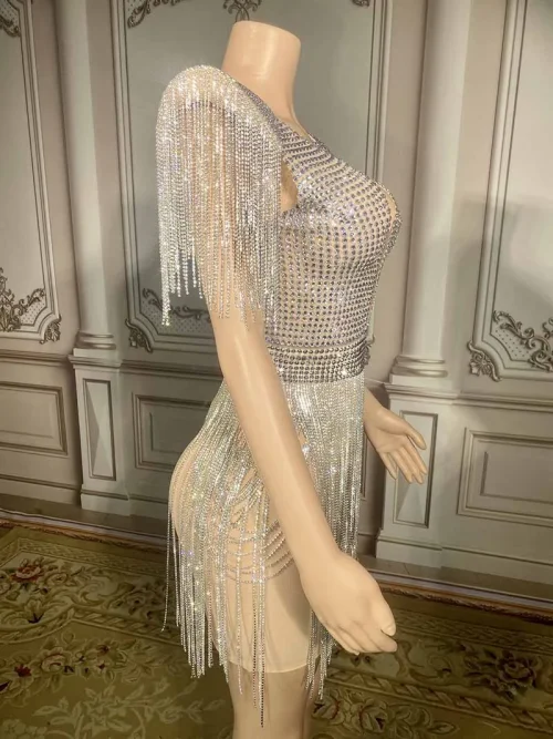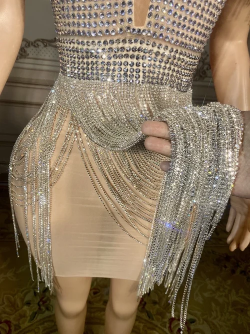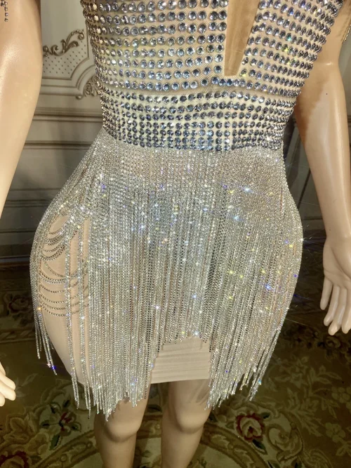 NOVANCE New Ladies Clothes Sexy V Neck Glittering Diamonds Fringes Silver Dress See Through Club Dress for Prom Party Nughtclub