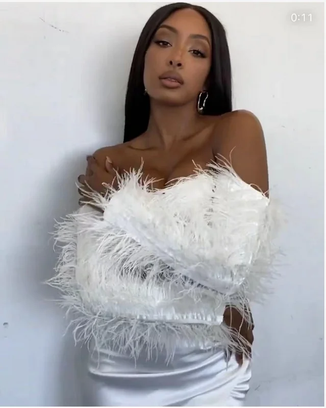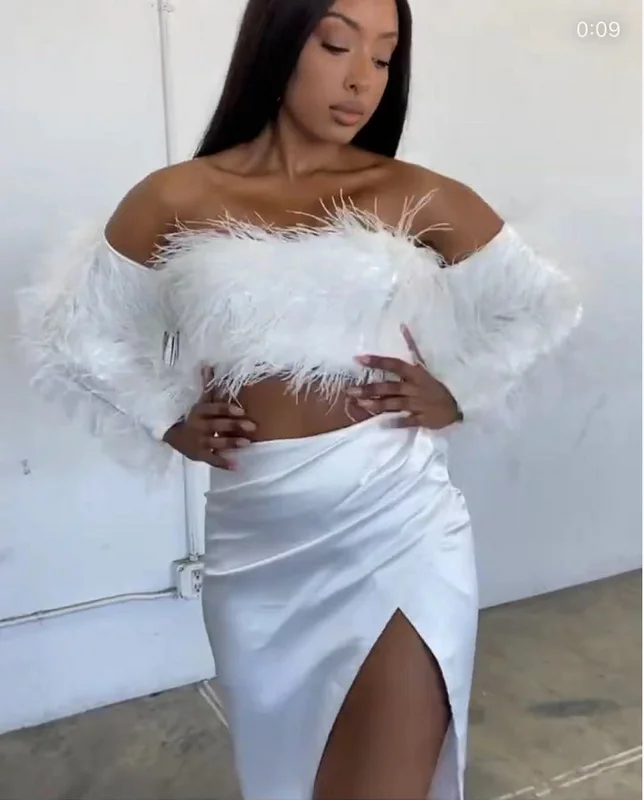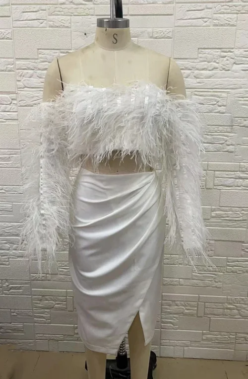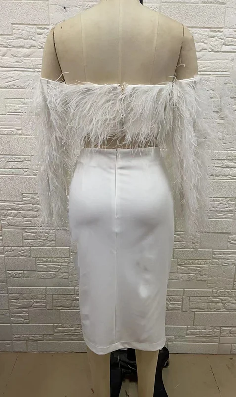 Product Name: Novance Women Sexy Summer Outfits Bodycon Midi Split Short Feather Cocktail Dresses Two-piece Set Sexy White Club Dress