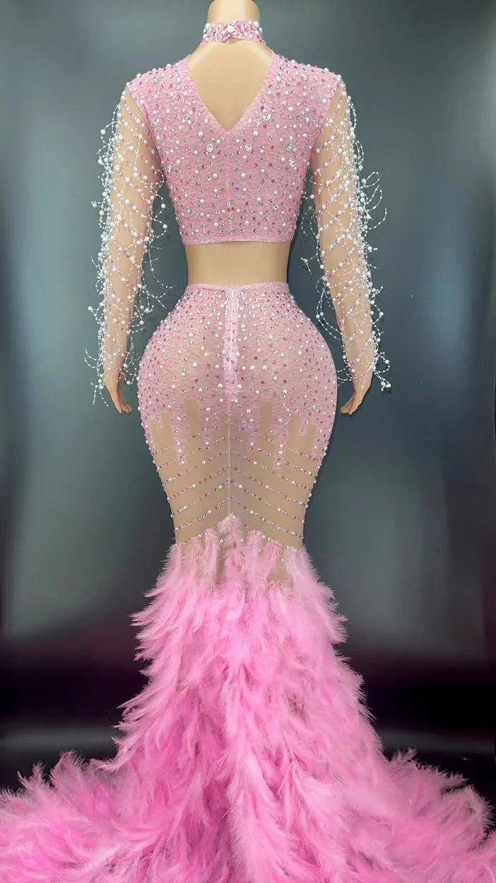Product Name: Novance Y2369-B Summer Outfits Two Piece Set Luxury Illusion Weeding Evening Dress Shiny Rhinestone Pearl Pink Feather Dress