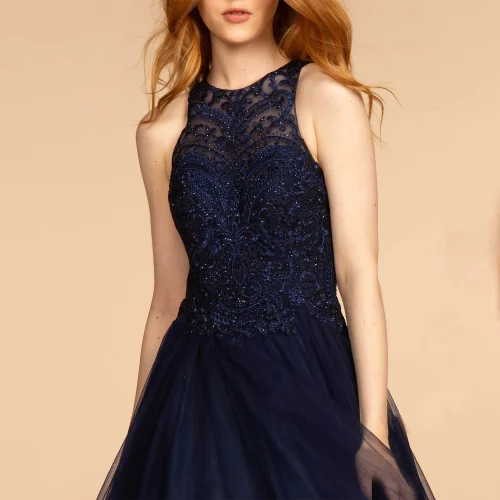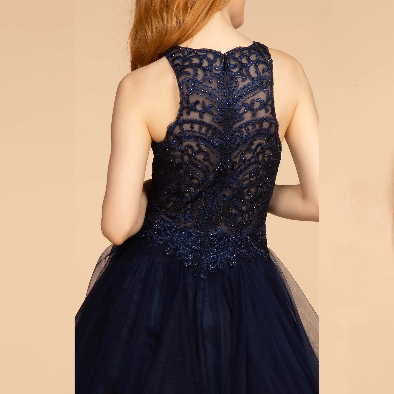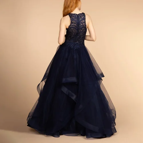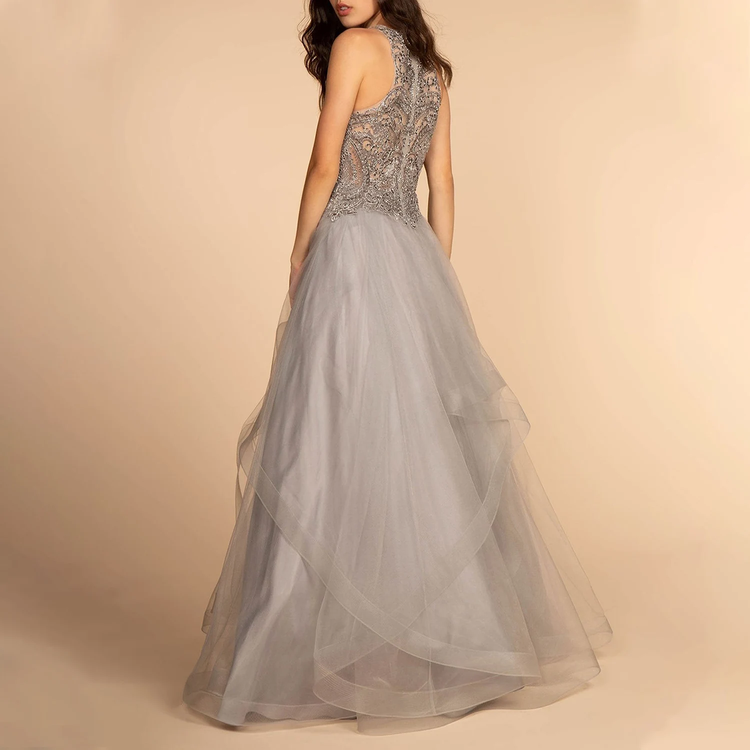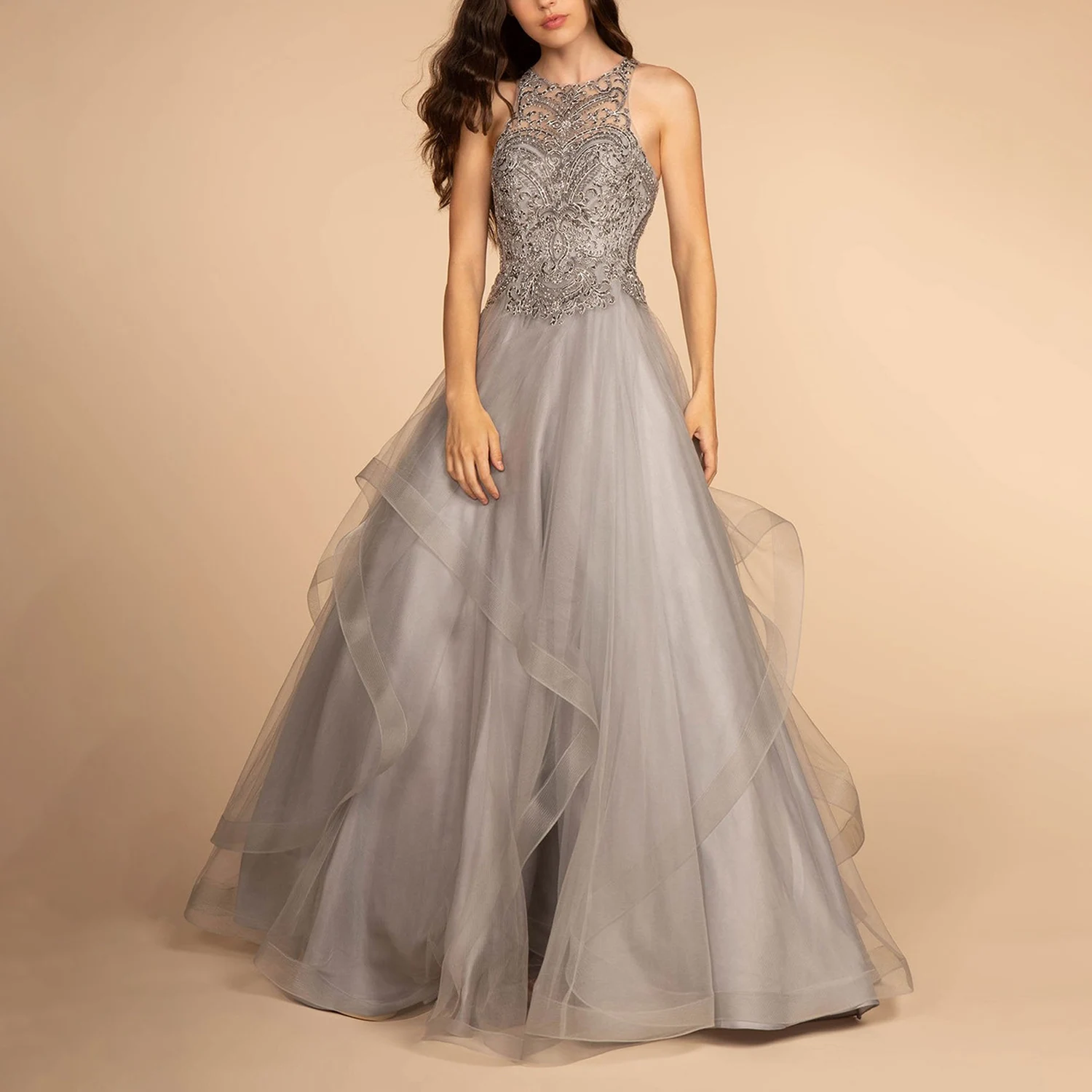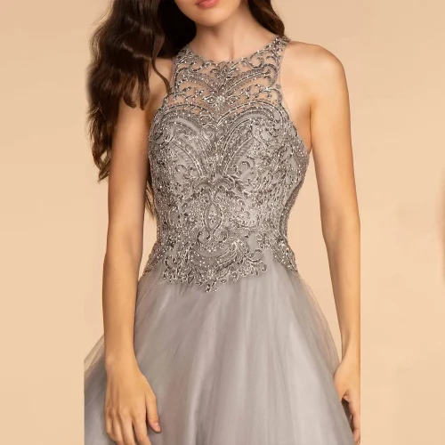 /ODM Deep O-Neck Gray Formal Satin Lace Decoration Puffy Tulle Beading Breathable Design Evening Dress for Women