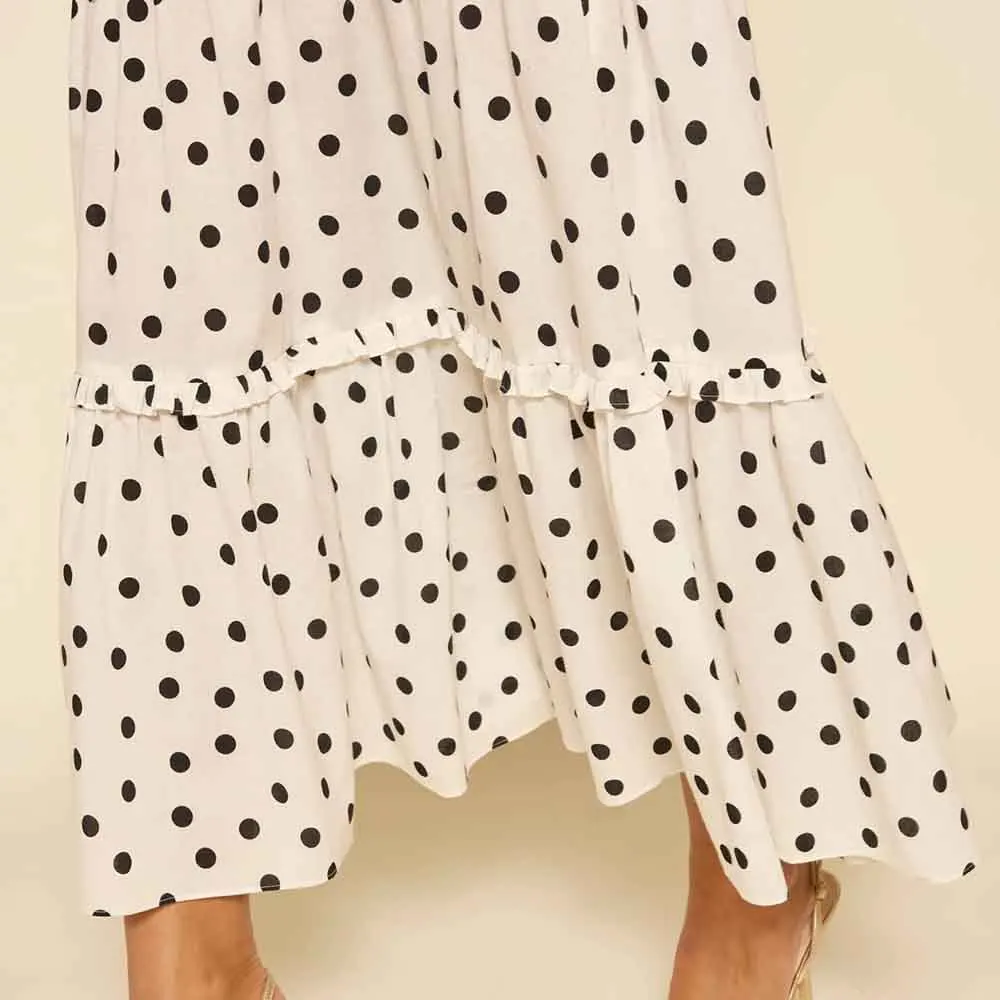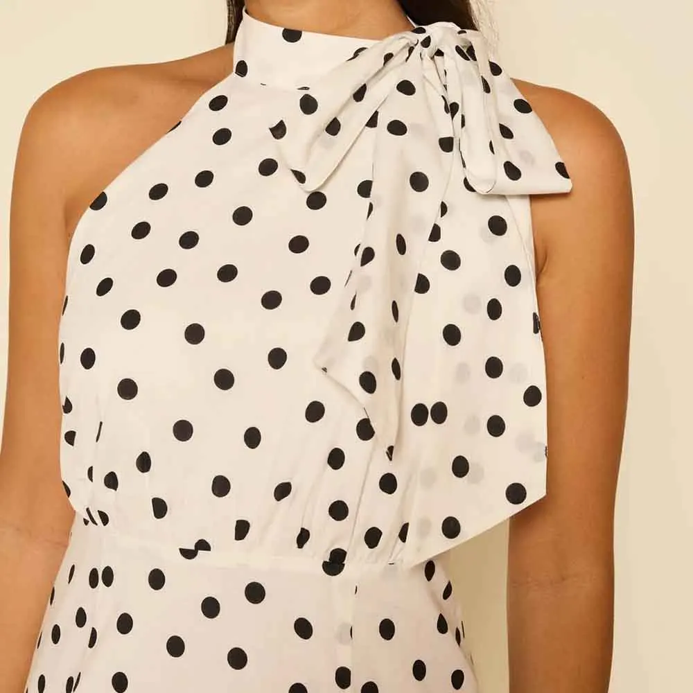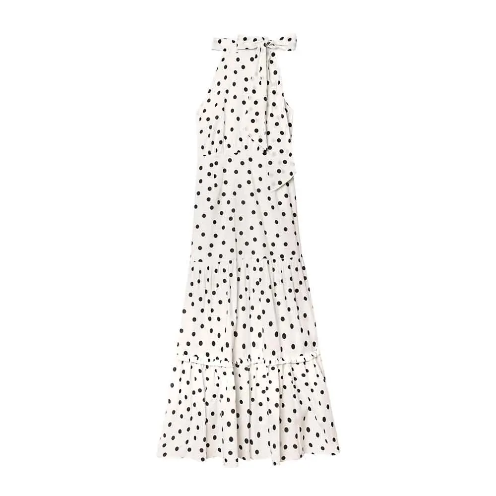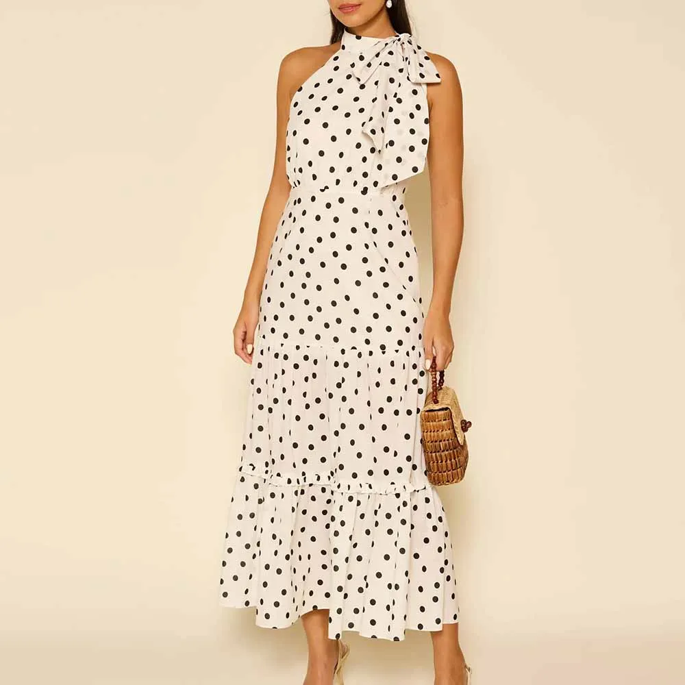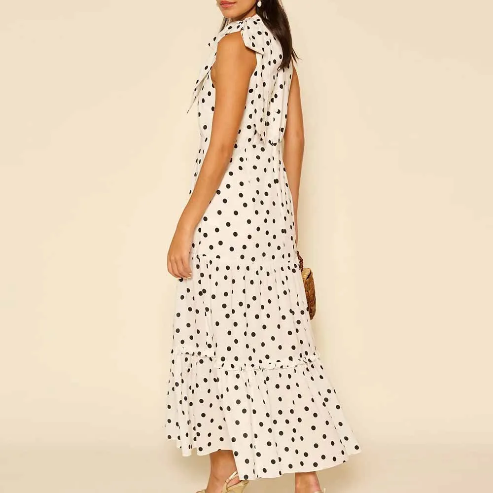 Product Name: ODM & Manufacturer High Quality Casual Polka Dot Print Bow Neck Sleeveless Ruffle Midi Dress