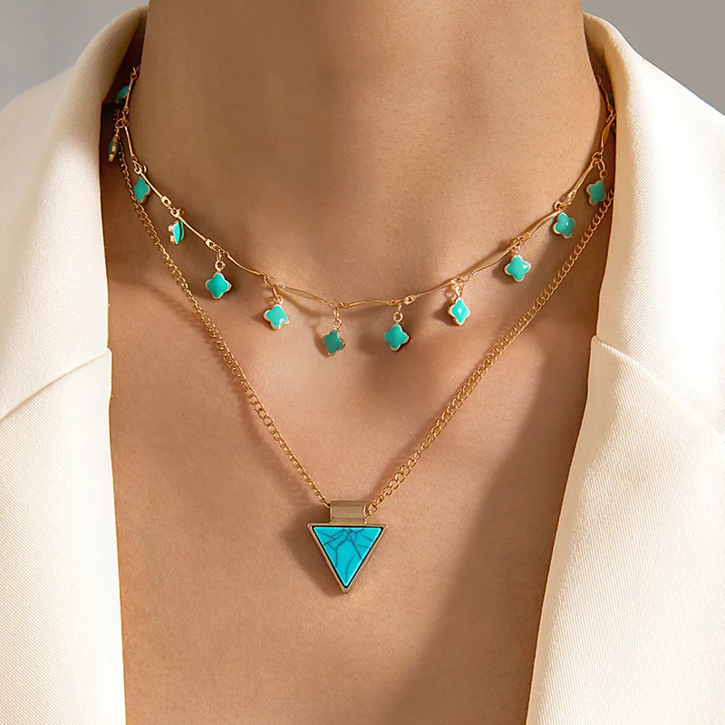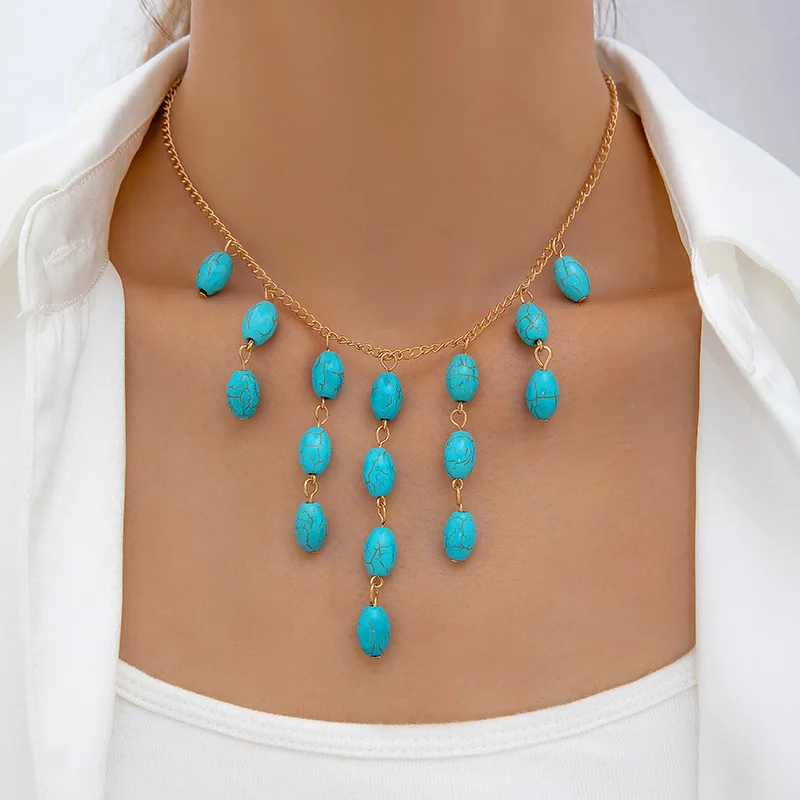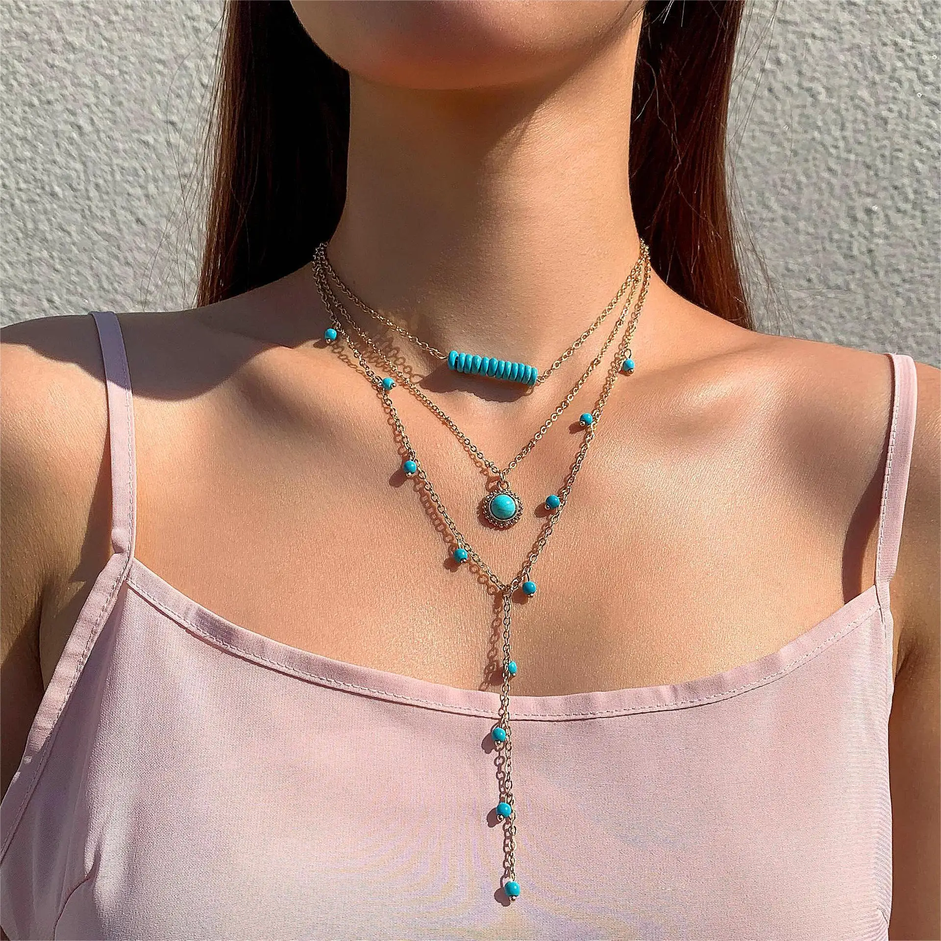 Product Name: Personalized Geometric Pendant Necklace Turquoise Beads Multi Layer Western Style Necklace for Women