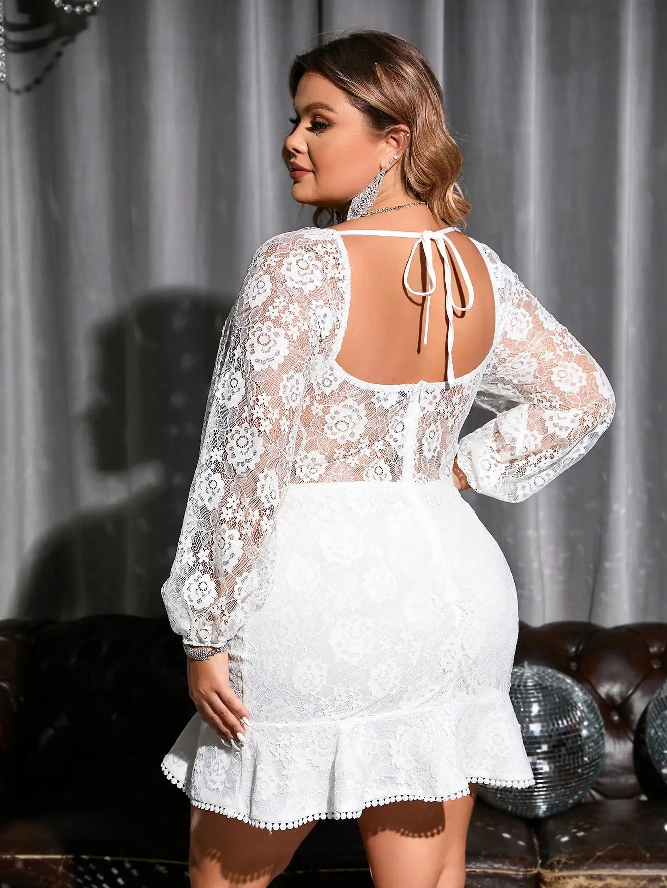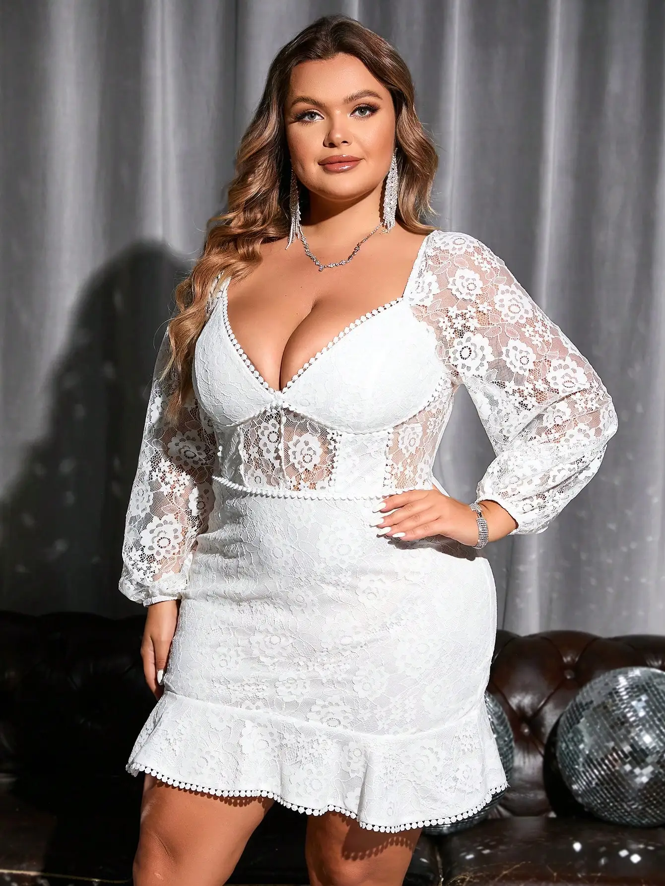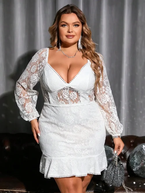 Product Name: Plus Sweetheart Neck Lantern Sleeve Ruffle Hem Dresses Women Lady Elegant Lace Dress