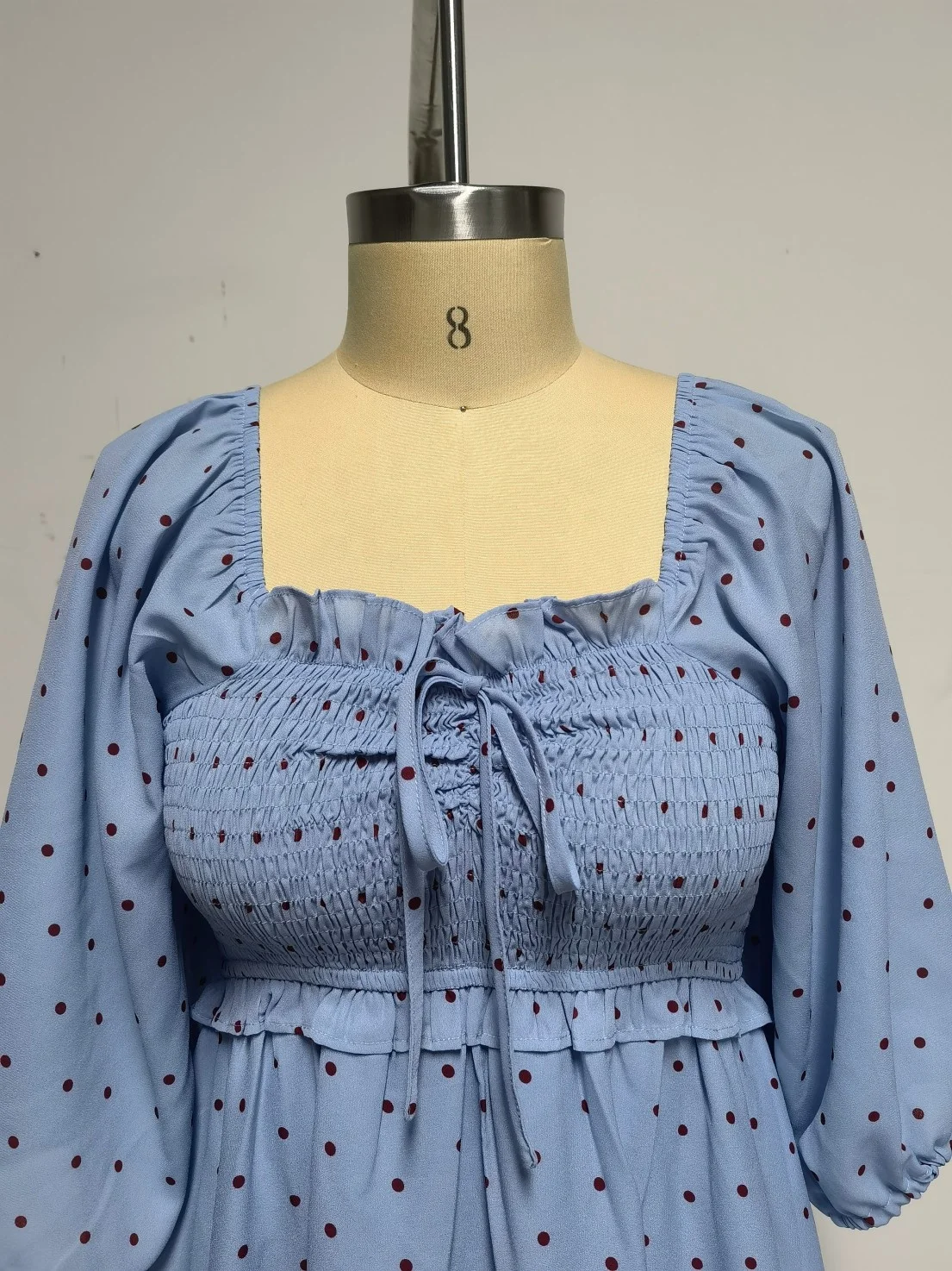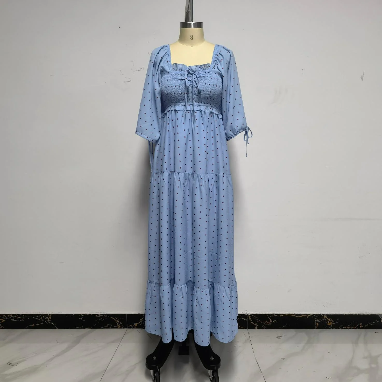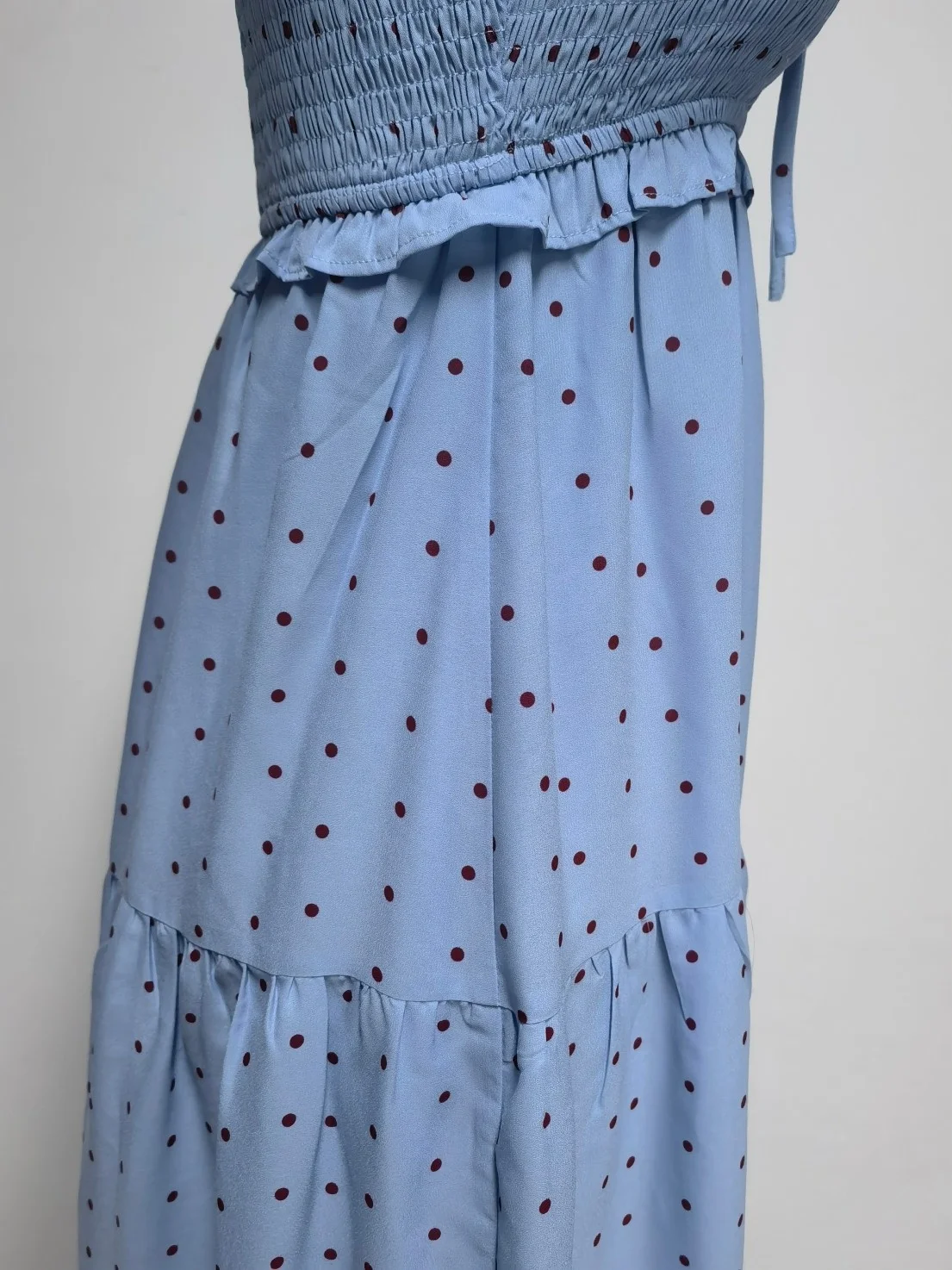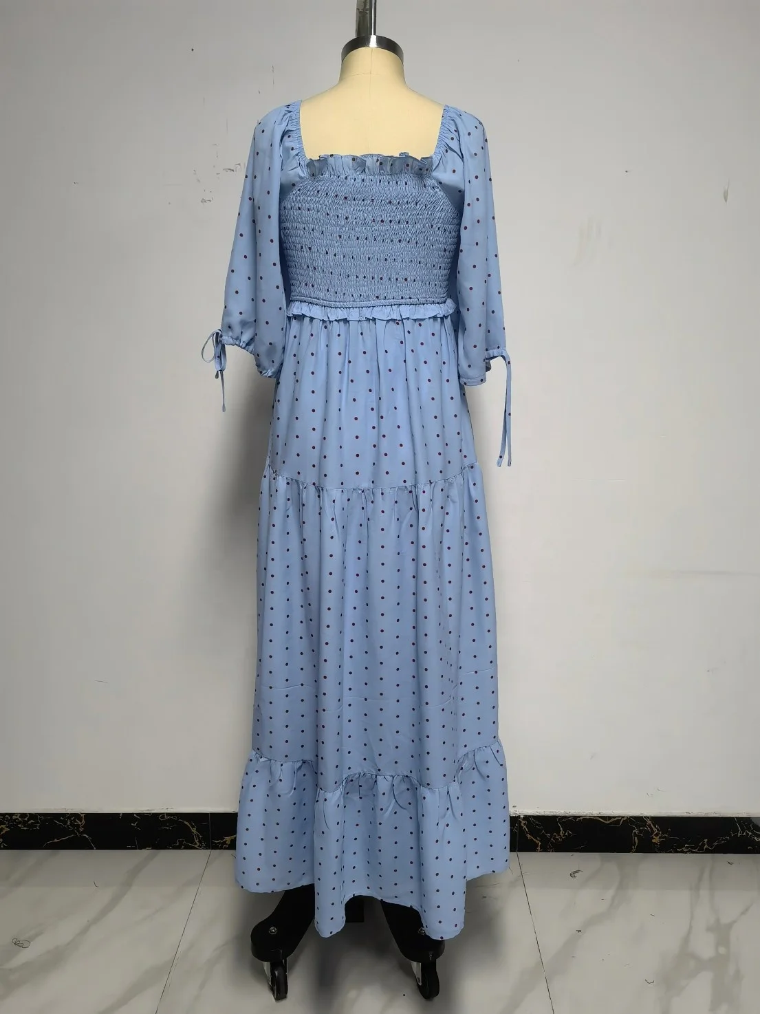 Polka Dot Bohemian Smocked Maxi Dress, High Quality Digital Print Flowy Summer Beach Sundress for Women