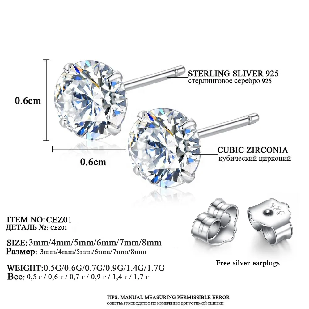 Product Name: Promotion Real 925 Sterling Silver Jewelry 3mm 4mm 5mm 6mm 7mm 8mm Round CZ Cubic Zircon Classic Stud Earrings
