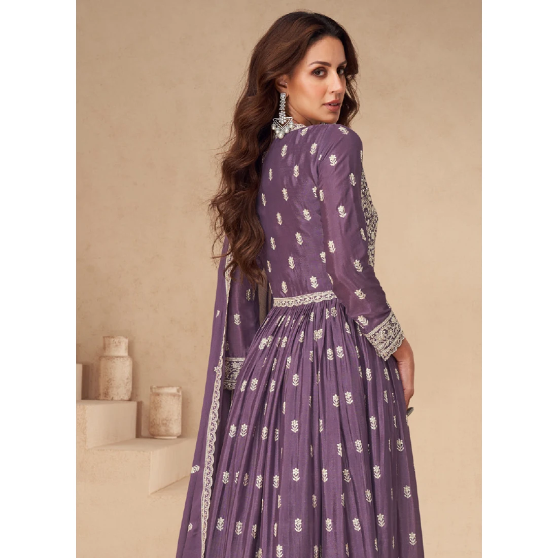 Purple Chinnon Silk Indo Western Wedding Wear Embroidery Work Readymade Wedding Dresses