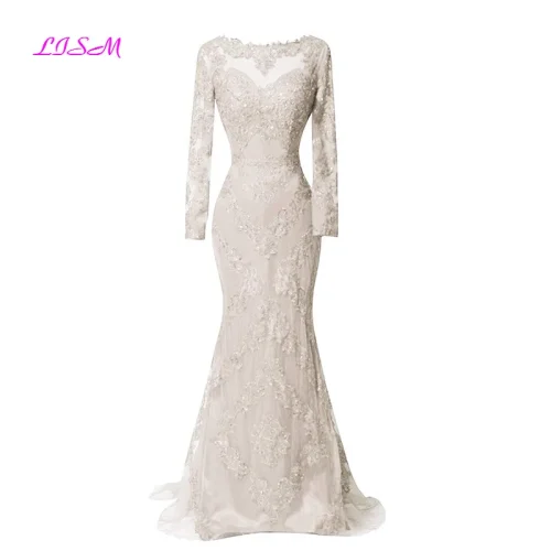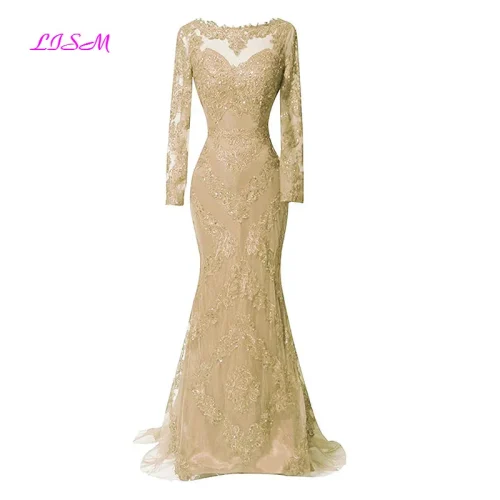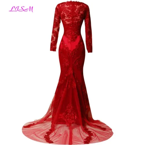 Product Name: Real Pos Red Full Sleeved Evening Dress 2023 Lace Appliques Mermaid Prom Dresses Elegant Long Sweep Train Formal Party Gowns