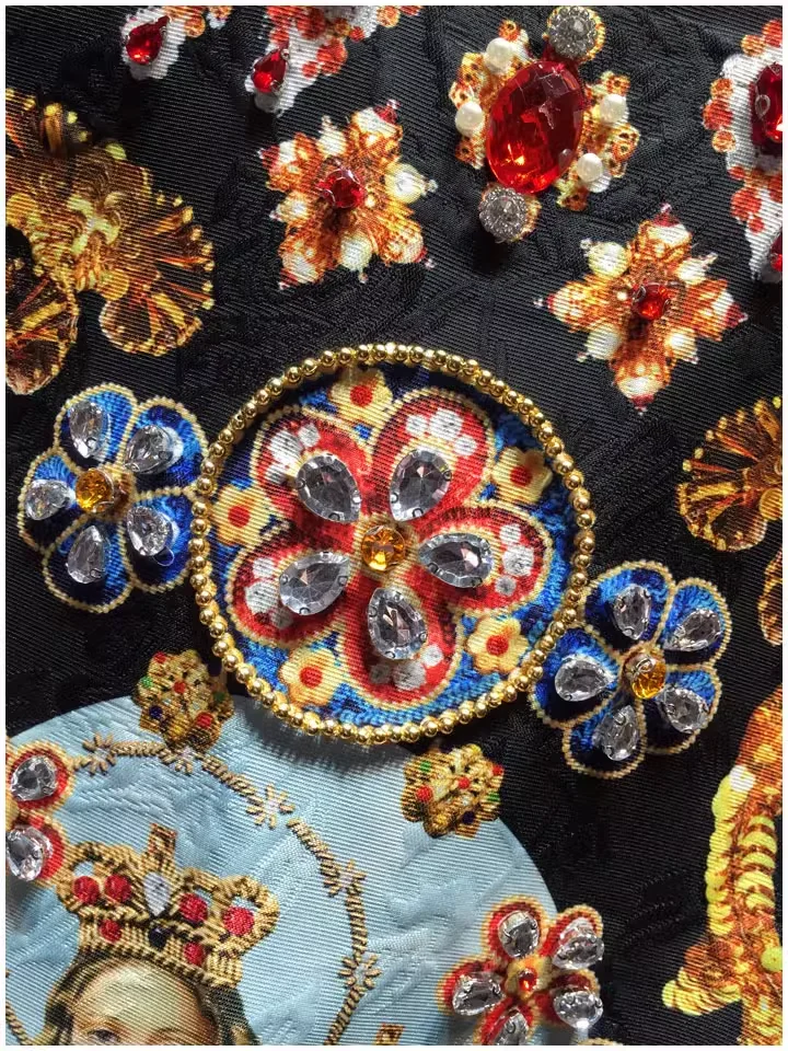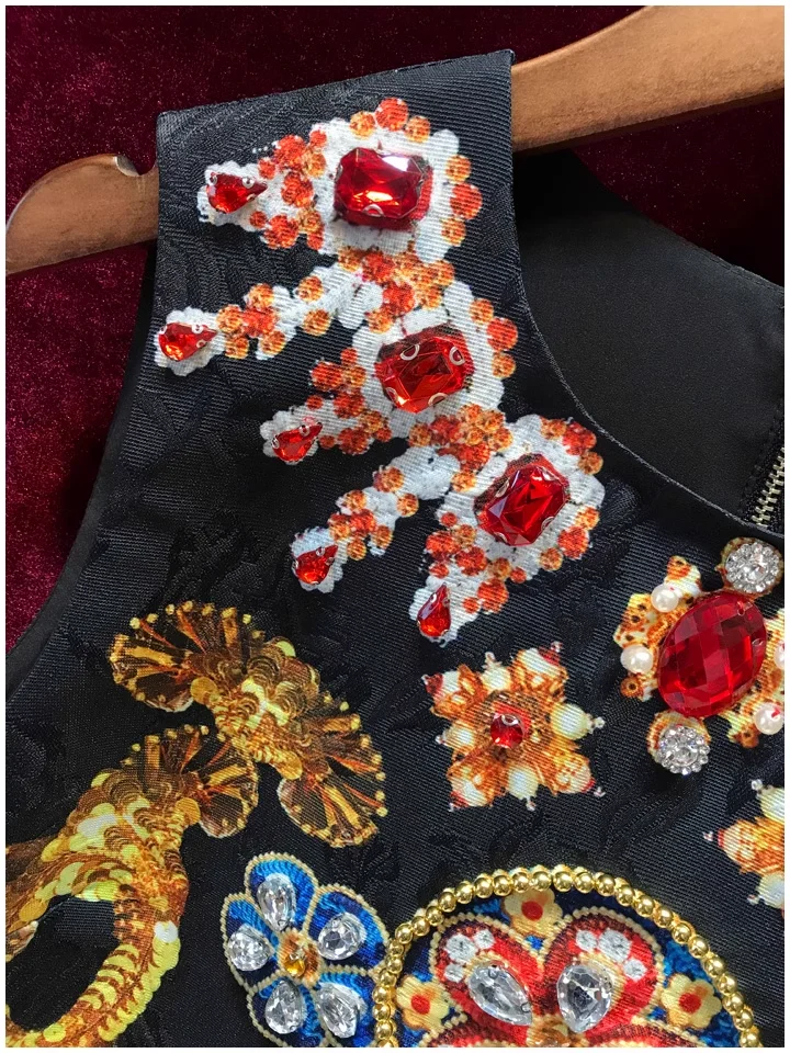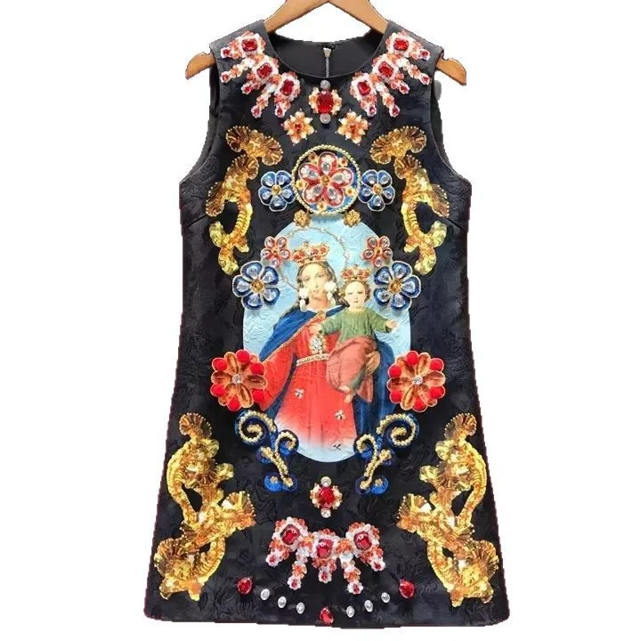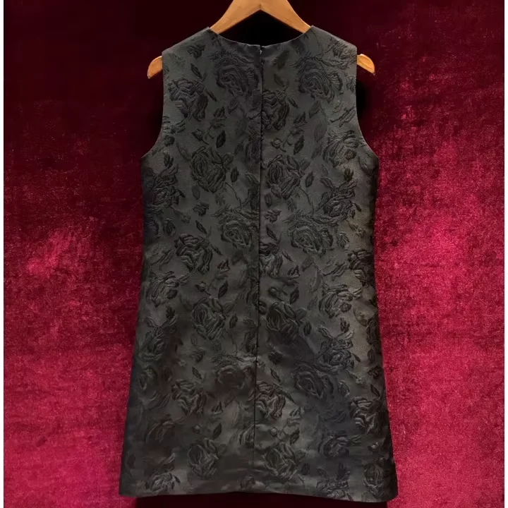 Product Name: Retro Printed Midi-Length Sleeveless Black Vest Dress Light Luxury High-End Diamond-Studded Woven Heavy Industry Inspiration