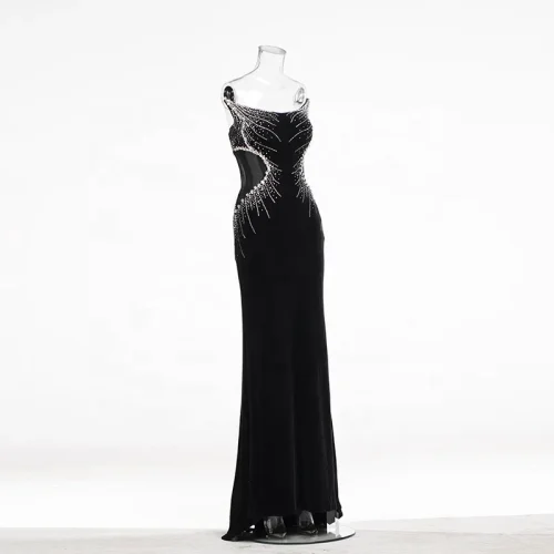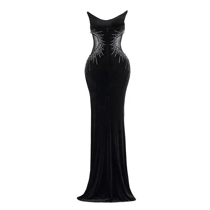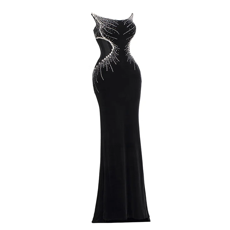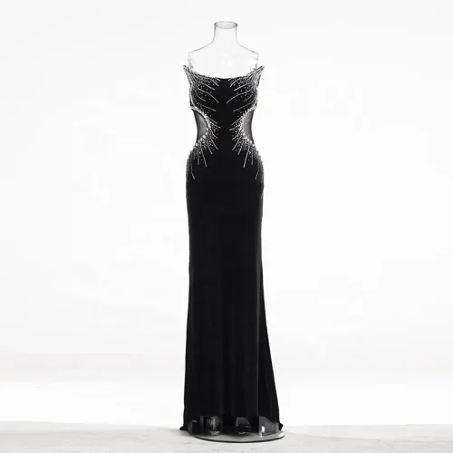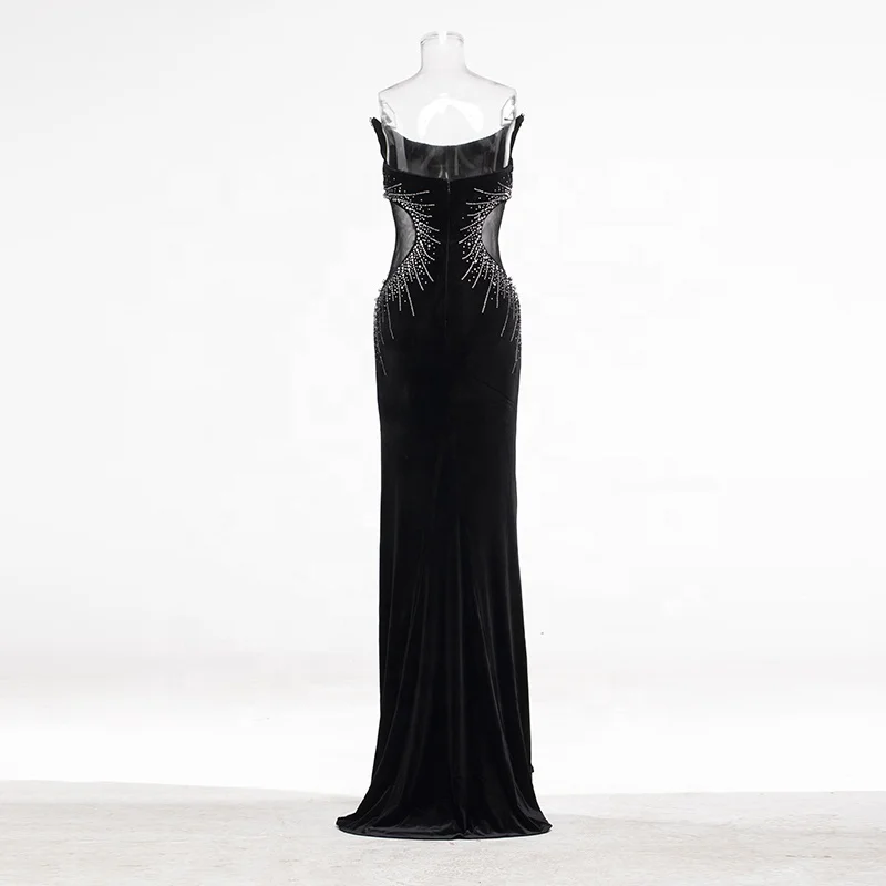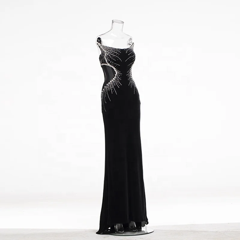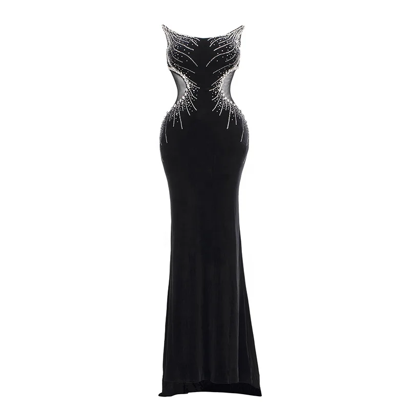 Product Name: Rhinestone Halter Slim High Slit Mesh Dress Tulle Elegant Bodycon Black Floor Length Formal Evening Club Prom Party Gown