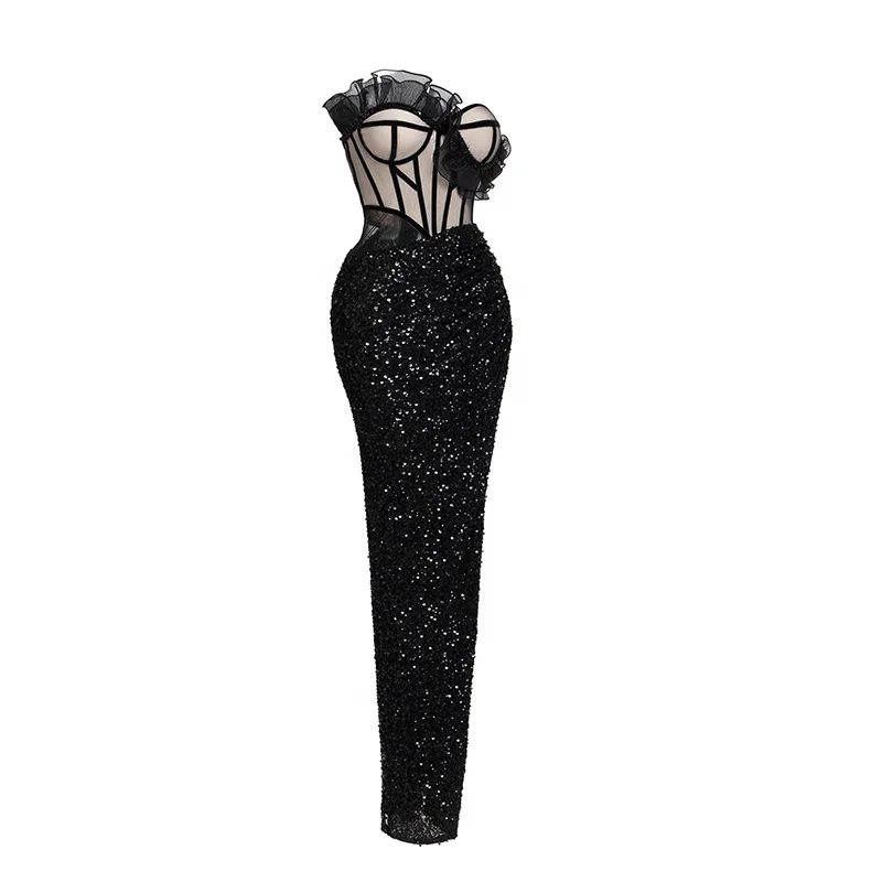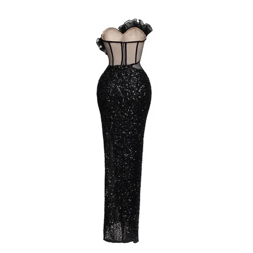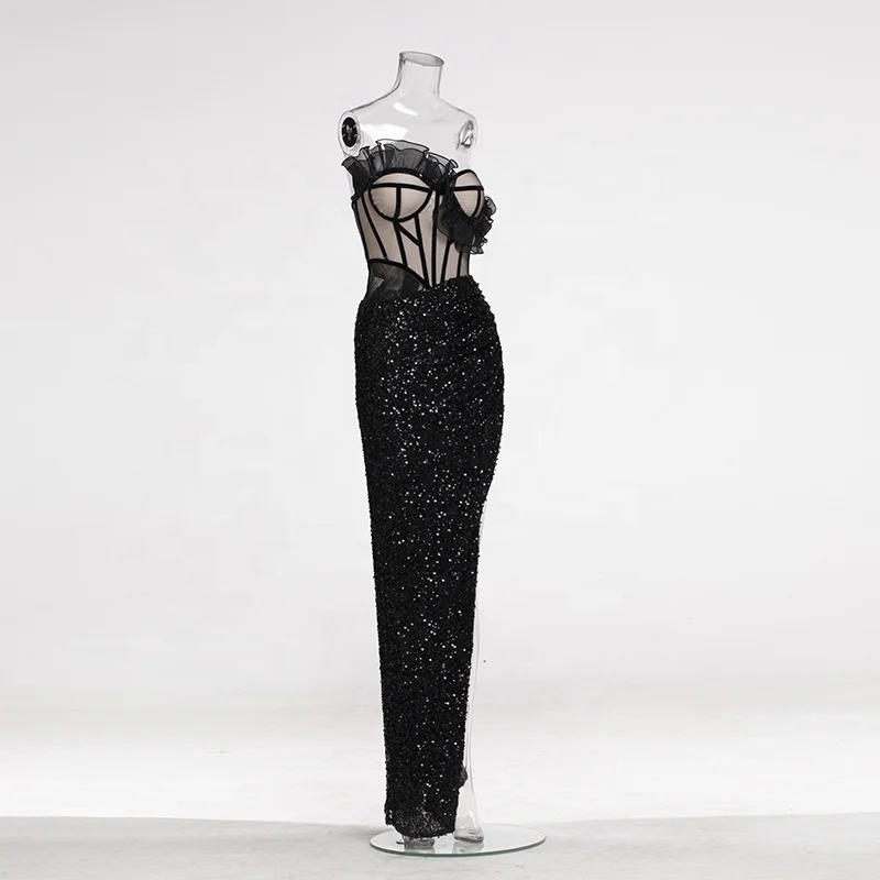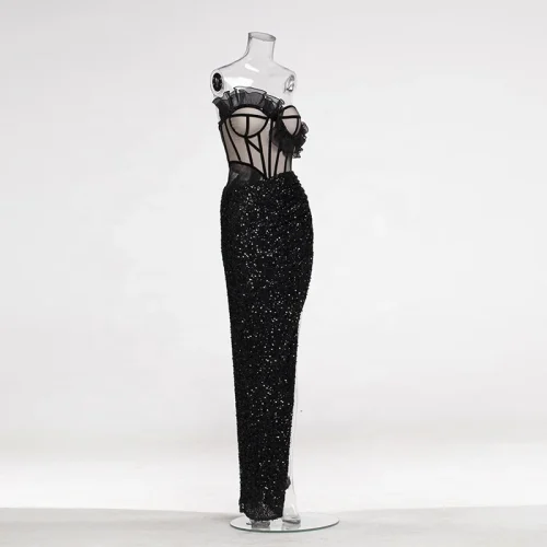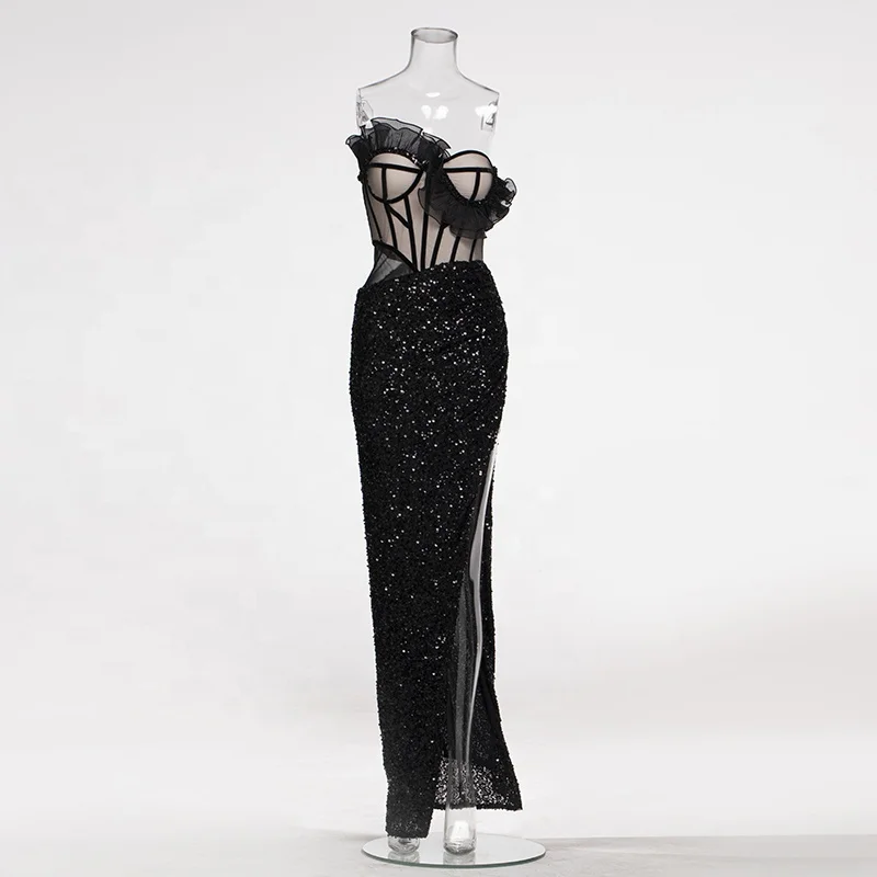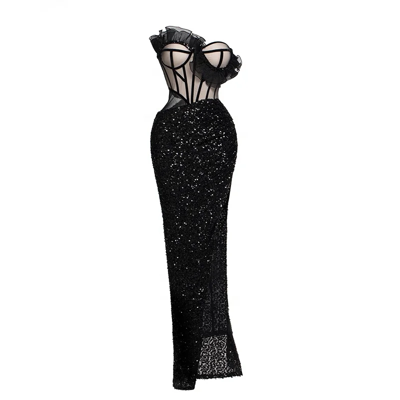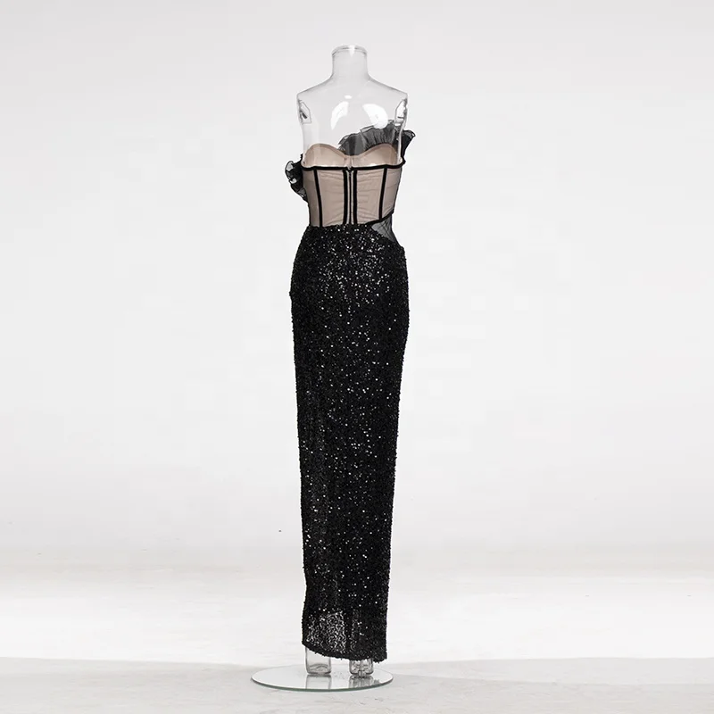 Sexy Strapless Sleeveless Halterneck High Split Sequins Long Dresses See Through Club Prom Cocktail Trendy Evening Gowns