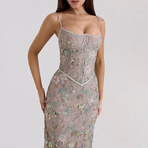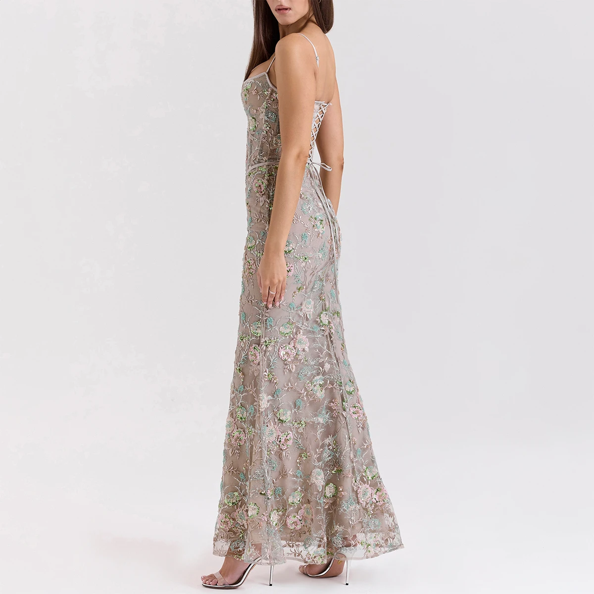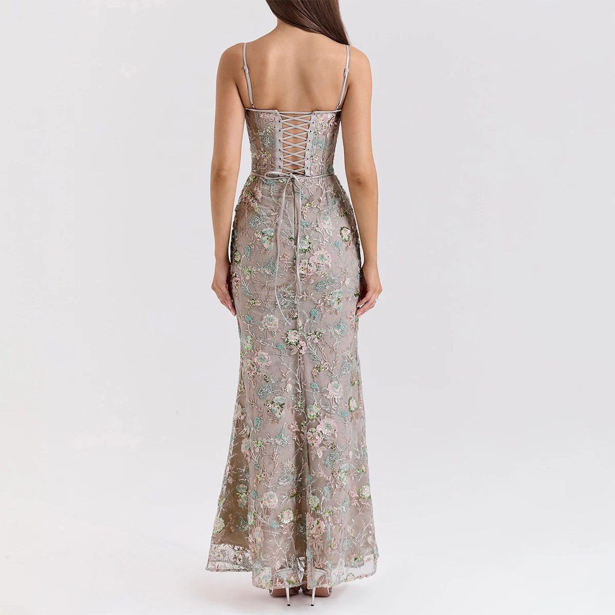 Silver Beaded Corset Maxi Dress Women Elegant Embellished Evening Gown Formal Wear Party Dress