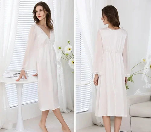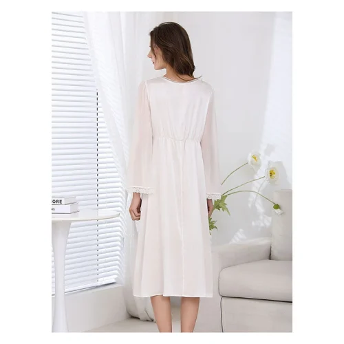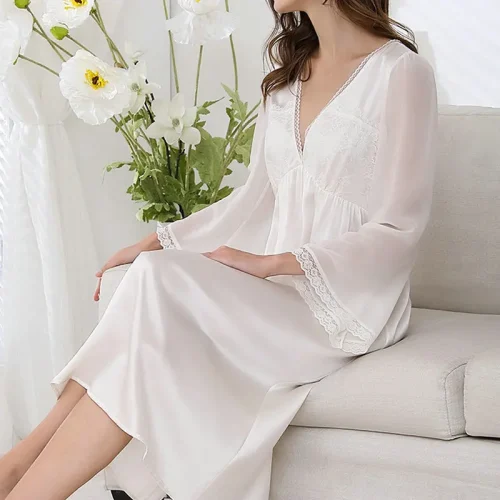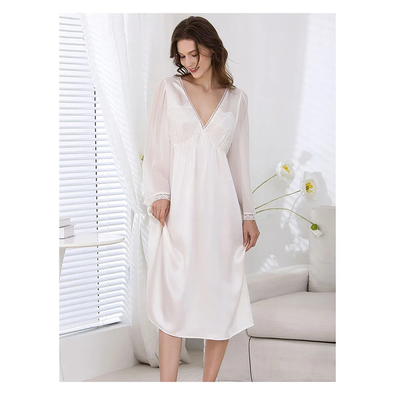 Product Name: Spring and Summer New French Royal Style 19mm 100% Silk Long Dress V-neck Lace White Nightdress