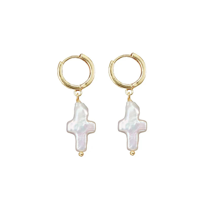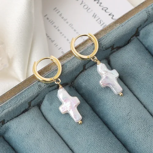 Product Name: Stylish and Simple Baroque Cross Freshwater Pearl Earrings Copper with Real Gold Plating
