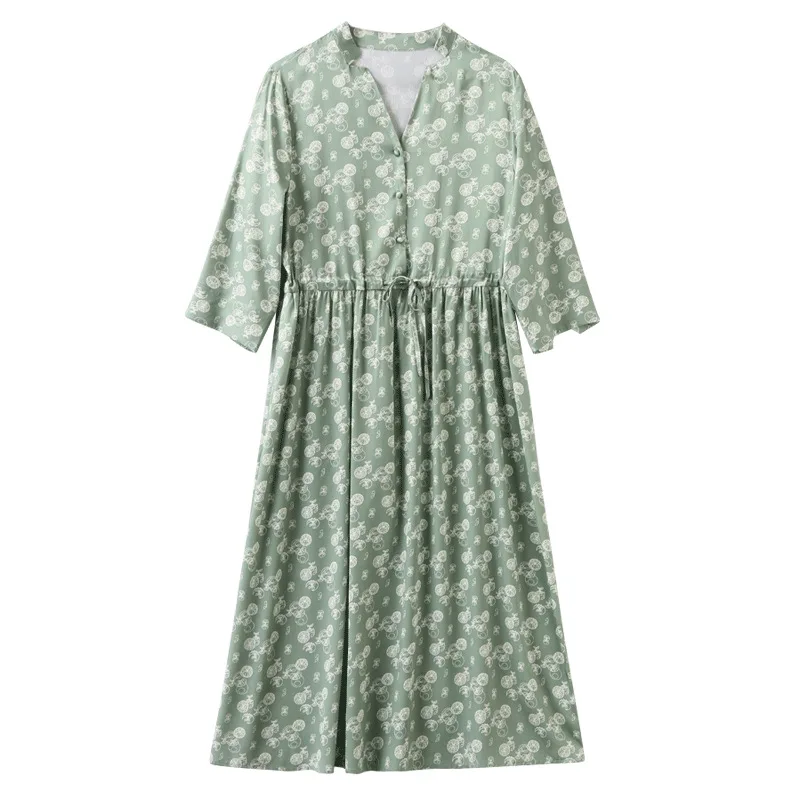 Summer Elegant and Versatile V-neck Silk Dress with Floral Prints and a Slimming Waist, a Long Silk Dress in a Casual Style