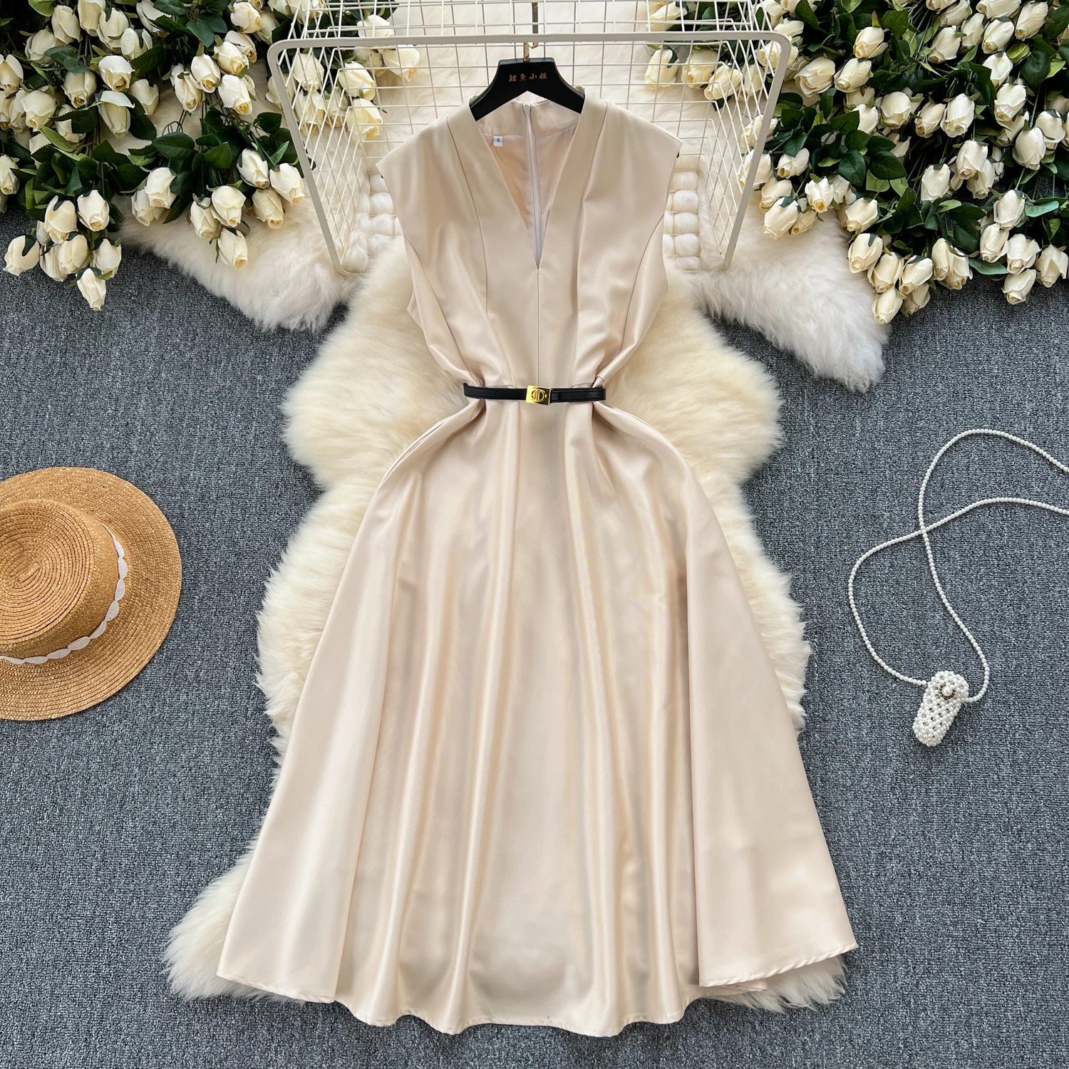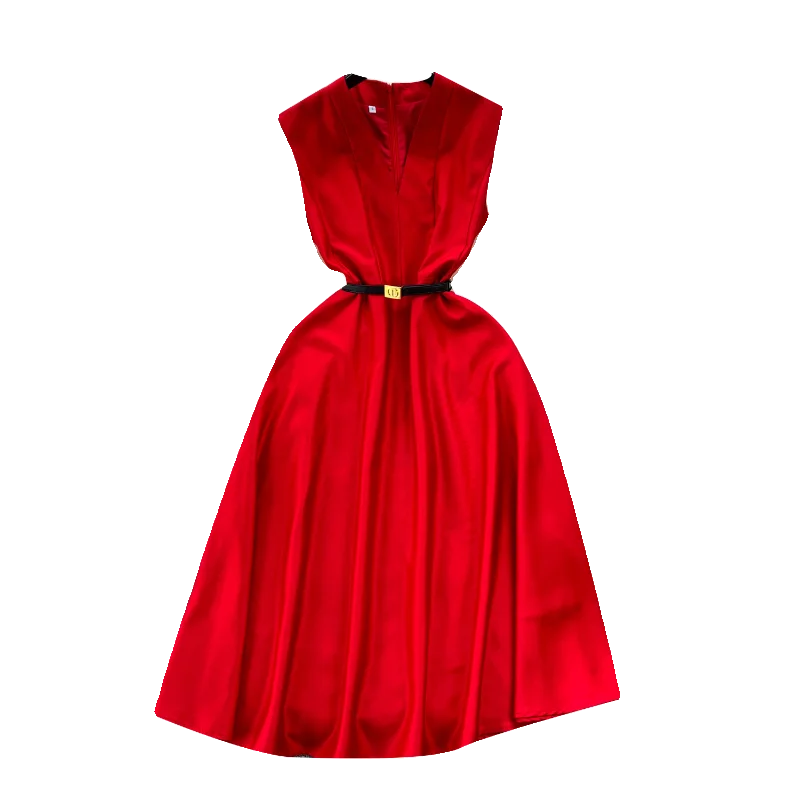 Product Name: Summer Elegant V-Neck Sun Midi Dress for Women Sleeveless Empire Lace Vestidos Red