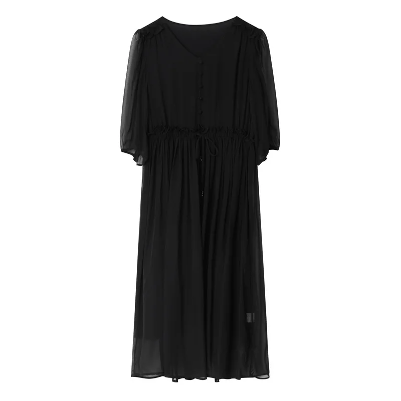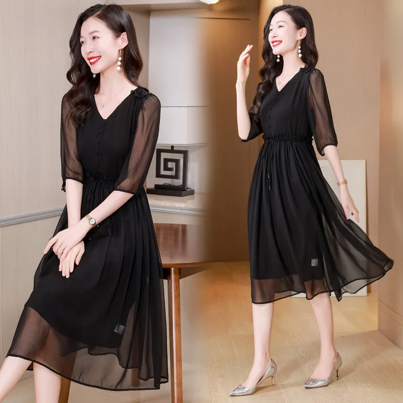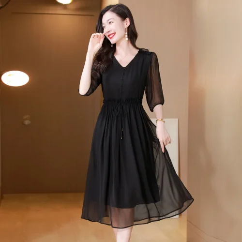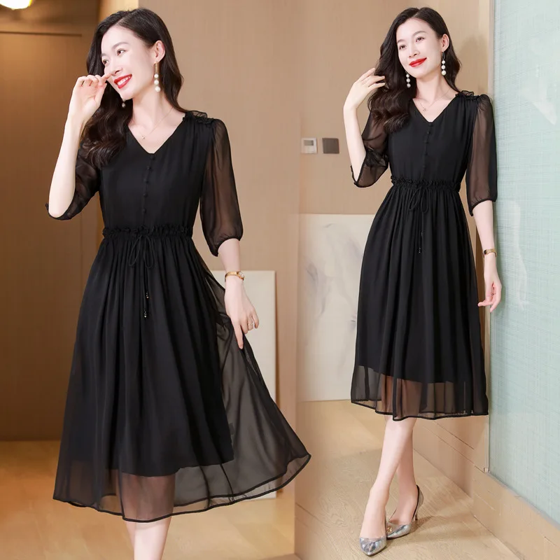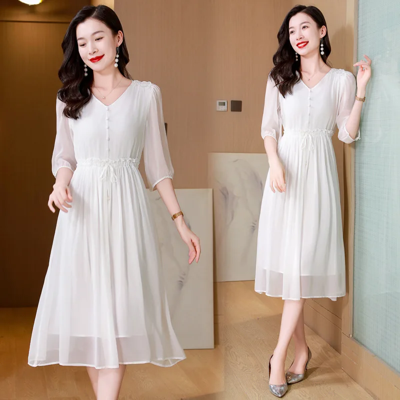 Summer New Mid-length High-end Silk Dress, Sweet French Solid-color Chiffon, Natural and Perfect Vacation Silk Dress