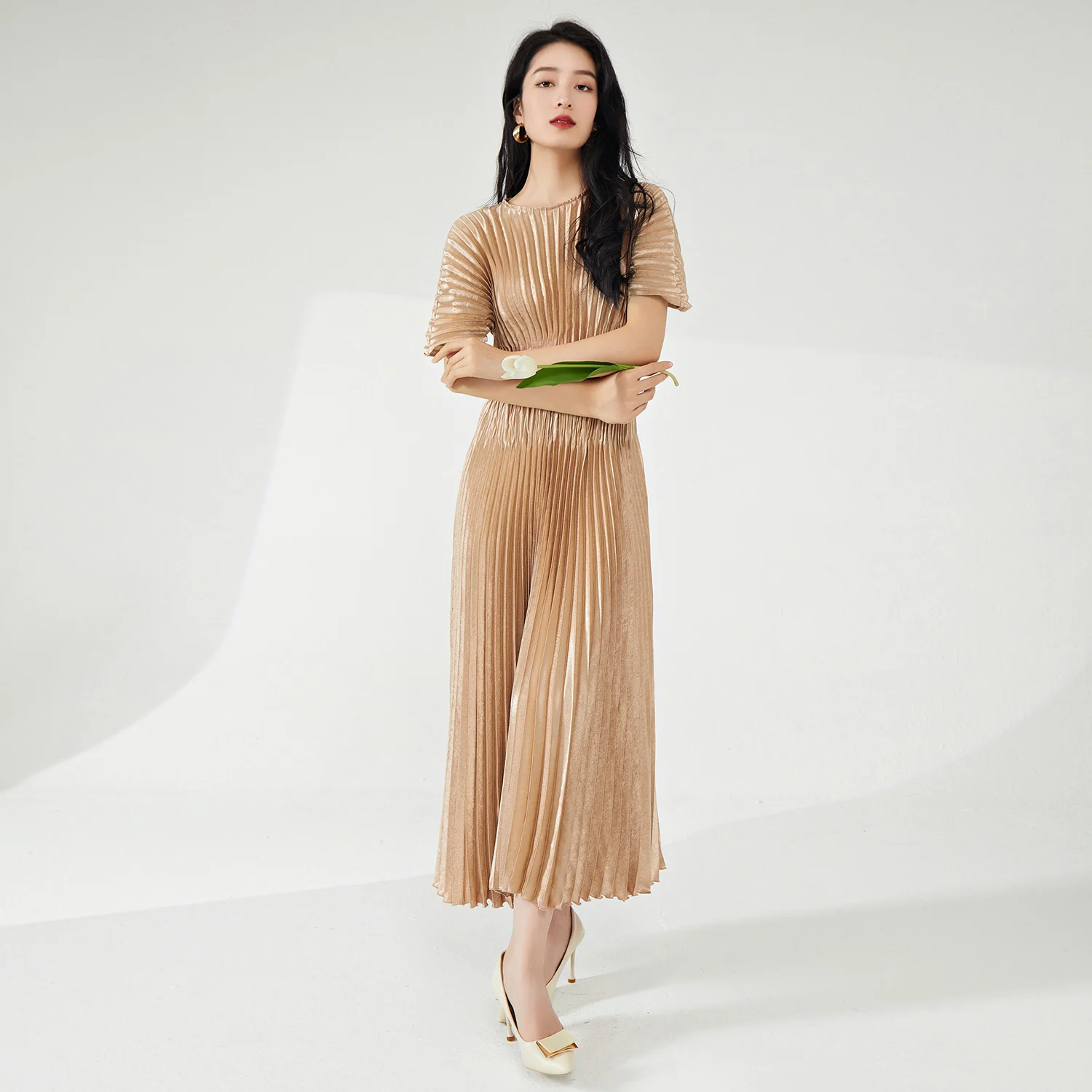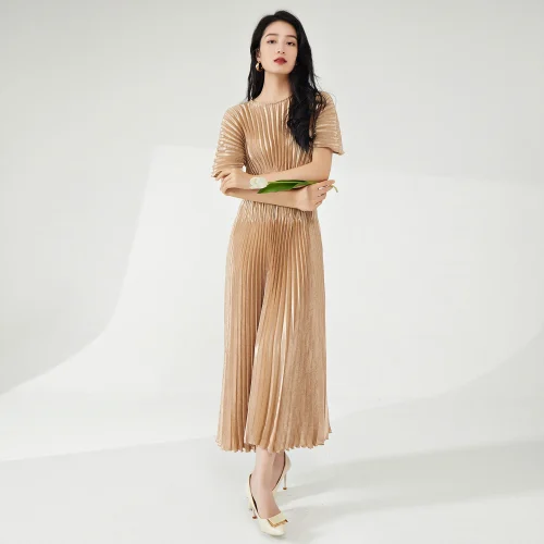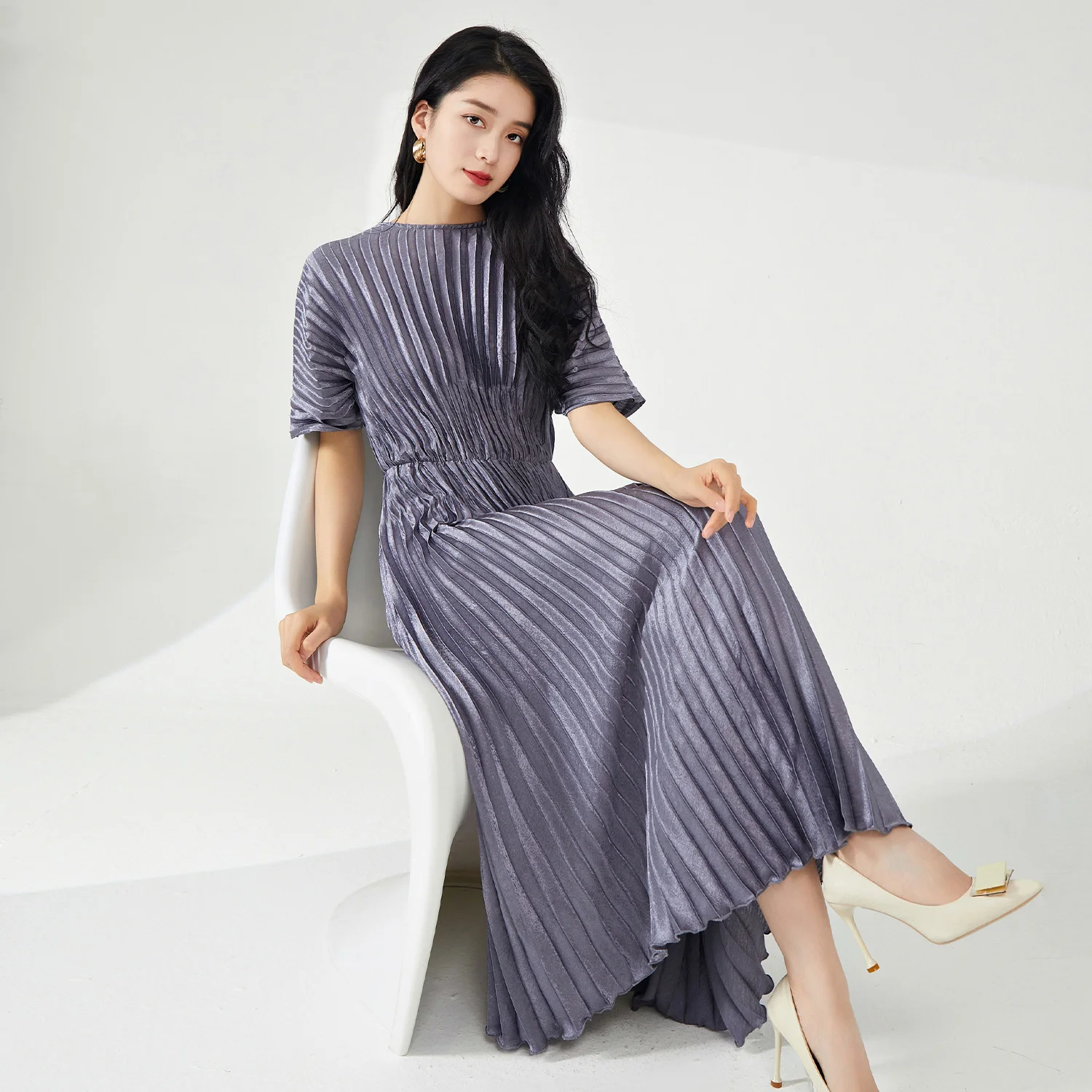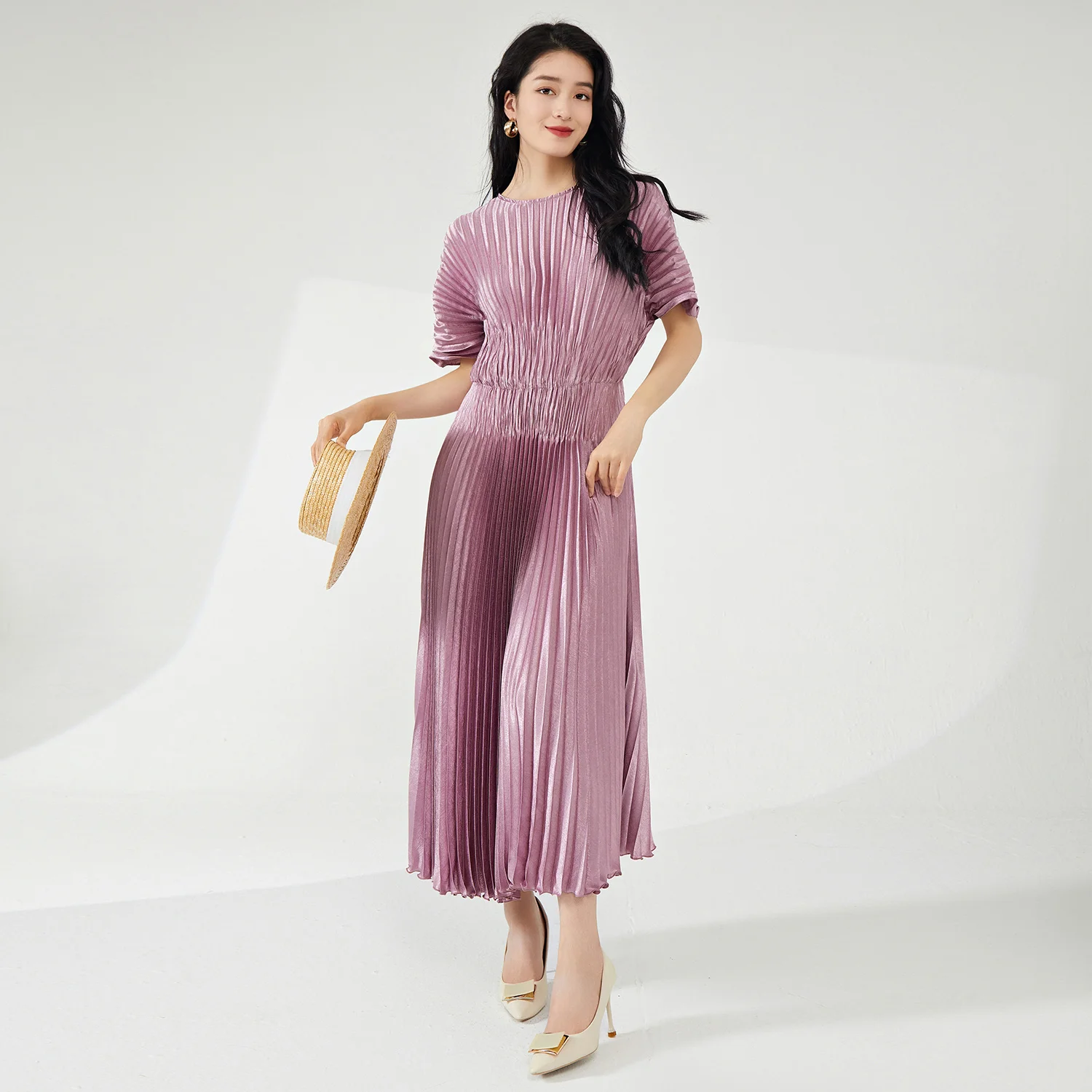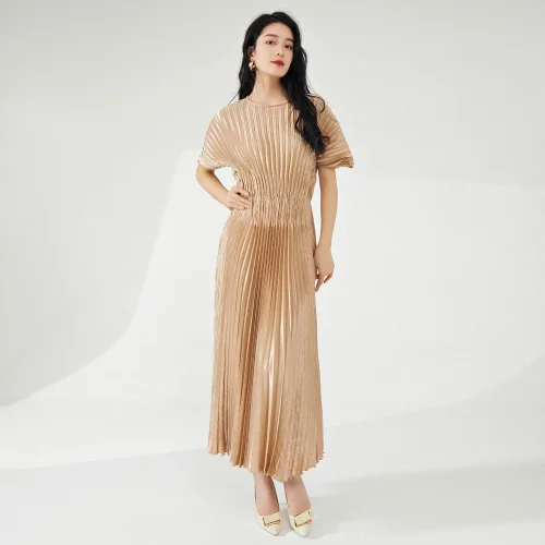 Product Name: Summer New Women’s Mid-Length Dress Fashionable Elastic Pleated Design with Short Sleeves Casual Woven Fabric Dress